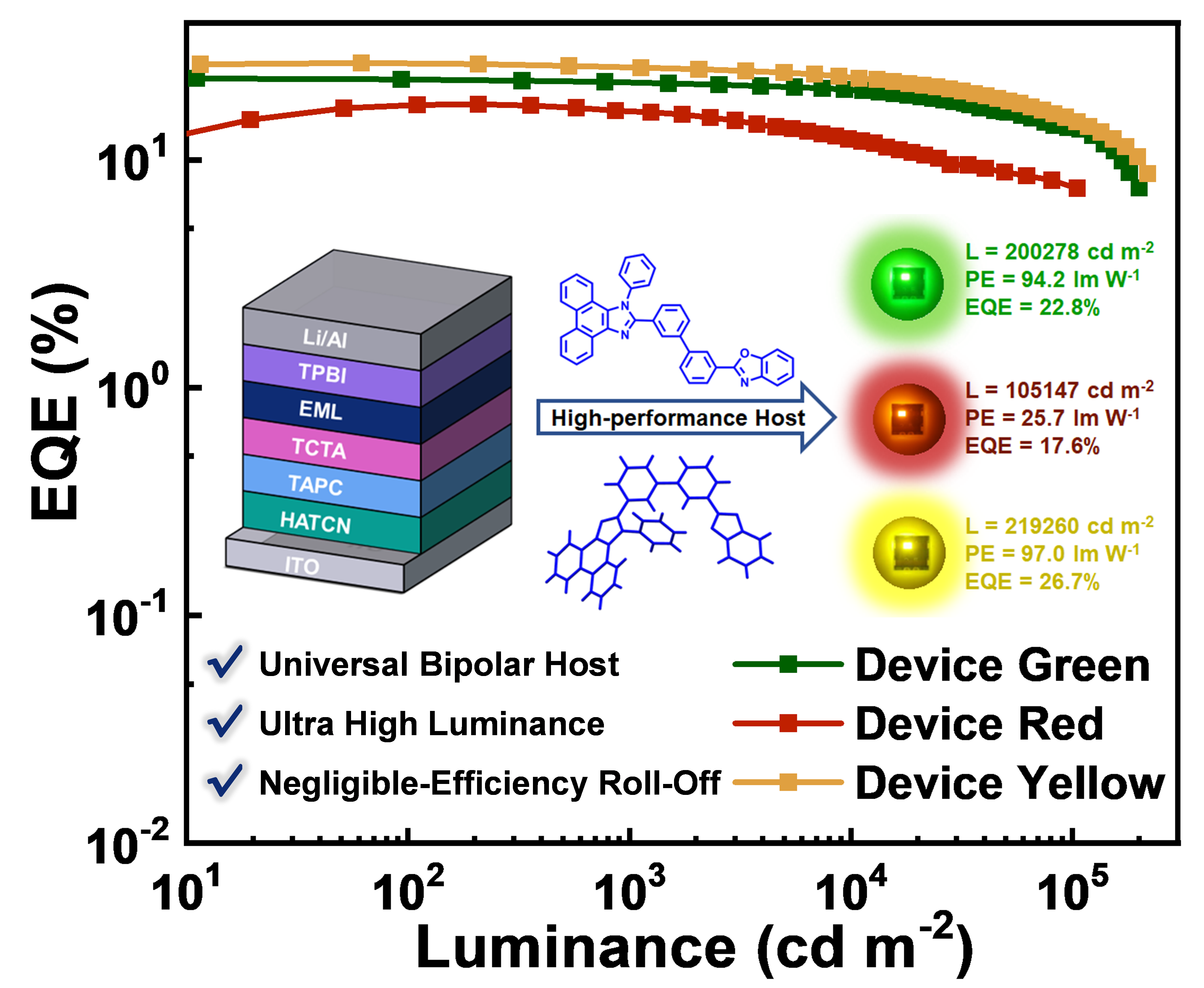 有机电致发光二极管 (Organic Light-Emitting Diode,OLED)具有宽视角、高对比度、柔性和低功耗等优点,一直是显示技术领域的研究热点。磷光OLED(PhosphorescenceOLED,PhOLED)因其可以实现100%的激子利用率,已成为主流的显示技术。但由于长的激子寿命,PhOLED必须依赖主客体掺杂发光层的器件结构,将磷光分子均匀地分散在主体材料中构成PhOLED的发光层,从而避免高电流密度下产生的三重态-三重态湮灭 (TTA)和三重态-极化子淬灭 (TPQ)等对器件效能的影响。同时,主体材料的引入还可以通过调节载流子注入、传输和能量转移过程提高PhOLED的电致发光性能。主体材料是影响PhOLED性能的关键材料。而同时具有高三重态能级 (ET)且平衡载流子迁移率的通用主体材料是实现高效率、低滚降PhOLED的重要前提。然而,目前能够实现兼顾高ET和平衡载流子迁移率的高性能主体材料在分子结构设计上仍具重大挑战。