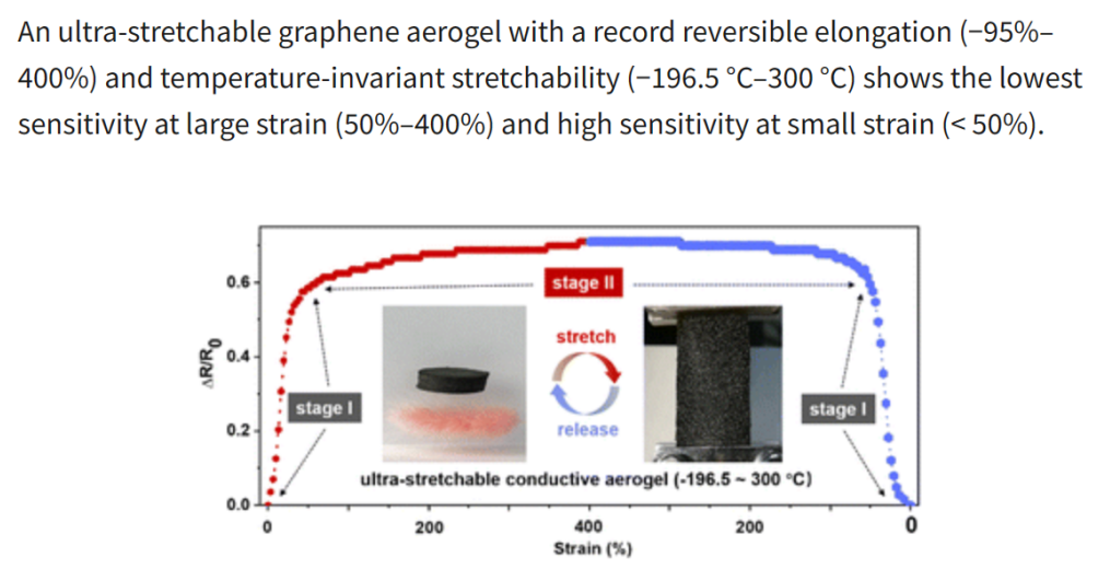 图2、超拉伸石墨烯气凝胶的应变-电阻响应特性和低温应用展示。