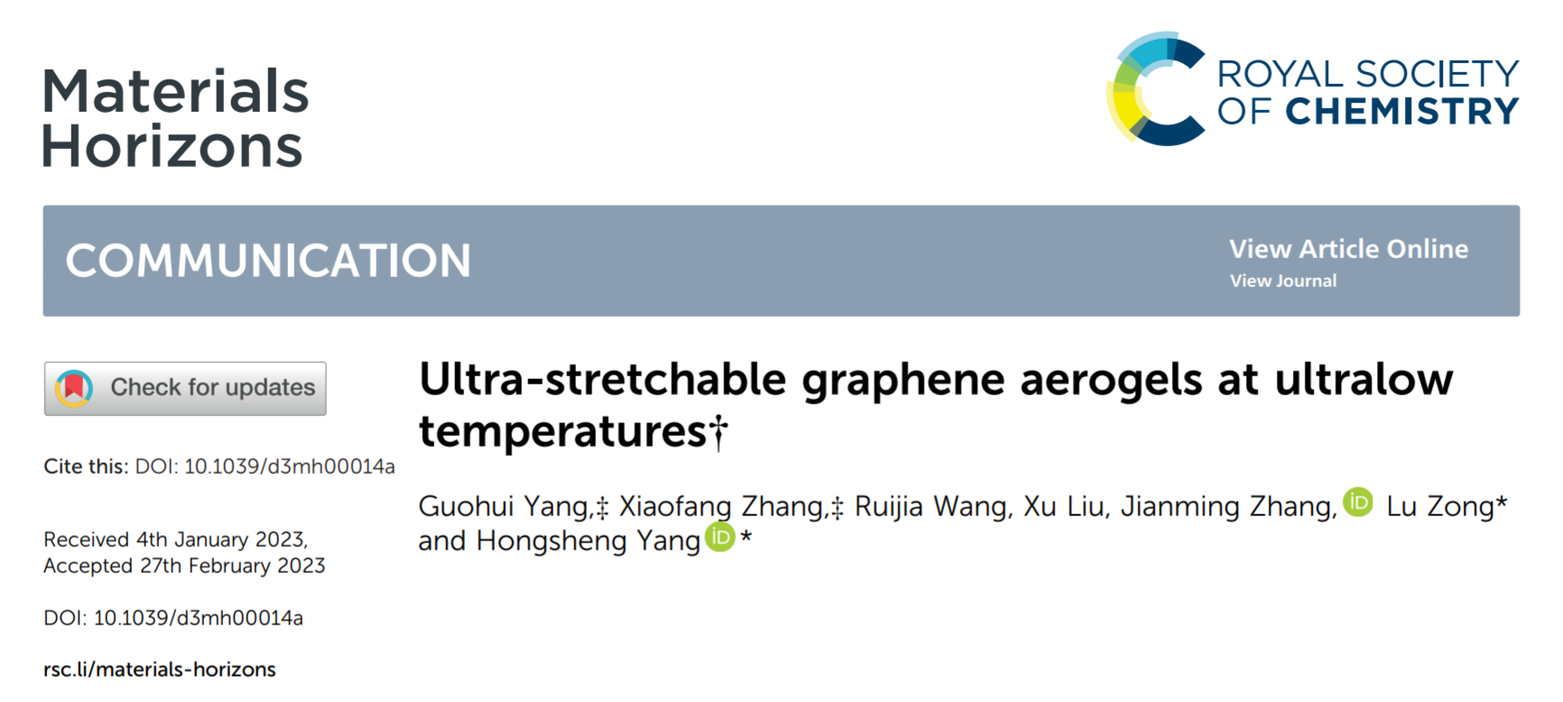 近日,KY开元集团官网高分子学院张建明教授团队等在材料领域知名期刊《MaterialsHorizons》(影响因子15.717,中科院分区材料1区)发表了题为“Ultra-stretchable graphene aerogels at ultralowtemperatures”的研究论文(DOI: 10.1039/d3mh00014a)。高分子学院硕士研究生杨国徽和张晓方副教授为共同第一作者,杨洪生副教授和宗鲁副教授为共同通讯作者。