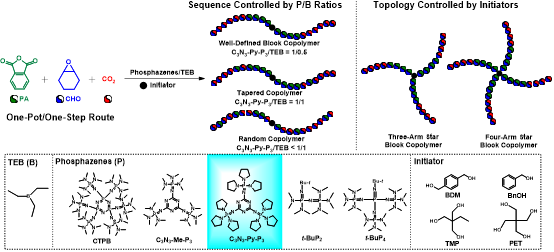 KY开元集团官网刘绍峰教授、李志波教授团队在环氧/酸酐(J. Polym. Sci. 2020, 58, 803-810; ACS Macro Lett. 2020, 9, 1398-1402)和环氧/CO2(Angew. Chem. Int. Ed. 2022, 61, e202111197)的ROAC研究中取得了一些成果。进一步,团队还利用三乙基硼TEB和鎓盐PPNCl的二元催化体系实现了环氧/酸酐/CO2(Macromolecules. 2021, 54, 763-772)的选择性三元共聚,通过一锅法成功合成了聚酯-聚碳酸酯嵌段共聚物。但受限于Cl-阴离子引发,该催化体系较难获得端基和拓扑结构多样化的聚合物材料。此外,目前报道的环氧/酸酐/CO2的一锅法三元共聚得到嵌段共聚物均带有少量的梯度结构。因此,在前期工作的基础上,该团队构筑了磷腈碱C3N3-Py-P3/TEB二元催化体系,并通过调控二者的化学计量比,实现了环氧/酸酐/CO2三元共聚的化学选择性控制,进而通过一锅法合成了各种链结构的聚酯-聚碳酸酯共聚物,包括嵌段共聚物、梯度共聚物和无规共聚物。