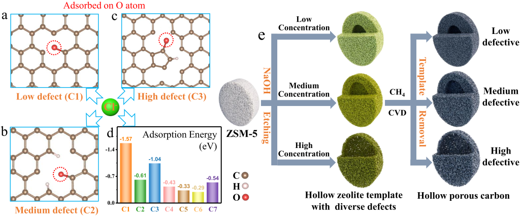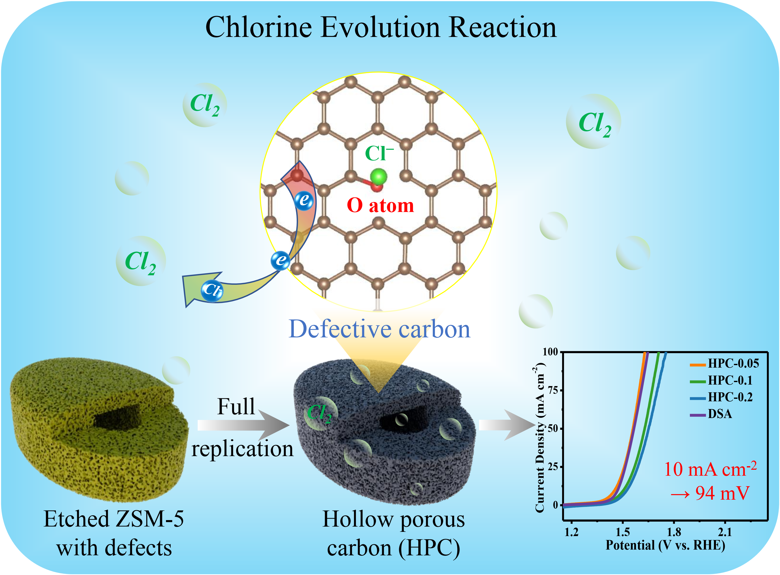 基于此,KY开元集团官网材料学院李彬特聘副教授和环境学院王磊教授等人报道了一种空心多孔碳纳米笼(HPC),并在形成的碳缺陷周围控制氧原子周围电子密度,以实现高效的CER。碱刻蚀可使空心结构的沸石产生缺陷。在硬模板策略中,碳缺陷的类型与沸石模板的刻蚀程度直接相关。更重要的是,氧原子可以从沸石框架中“借用”到缺陷碳上。不饱和O原子周围的电子密度在碳低缺陷度上比高缺陷度上低,有利于Cl−的吸附。该催化剂可复制分级沸石结构,具有中空特征和高比表面积。这一优势使其在控制气泡附着状态、有效排斥已形成气泡、增强电解质扩散、降低欧姆电阻和加速反应动力学等方面具有优异性能。结果表明,合成的HPC纳米笼具有良好的电催化性能,在电流密度为10 mA cm−2的条件下,过电位低至94 mV,稳定性好且优于商用贵金属催化剂DSA,是目前已报道的碳材料中最好的。