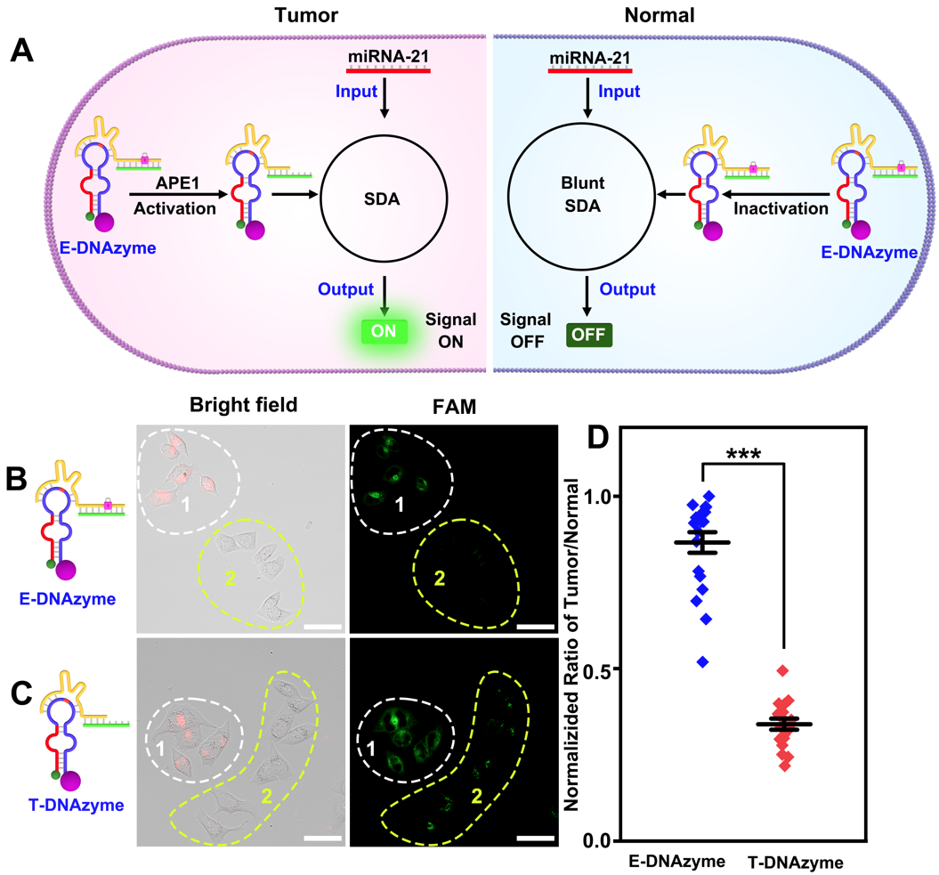 图1 内源性APE1激活的DNAzyme信号放大策略用于肿瘤细胞特异性分子成像示意图。图片来源:Anal. Chem.