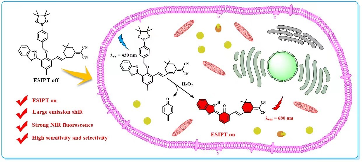 过氧化氢(H2O2)是生物体内常见的活性氧物种之一,对细胞信号传导、机体免疫反应等正常生理功能的实现具有重要作用,被视为是阿尔兹海默症、肿瘤、心血管疾病、亨廷顿病和帕金森病等多种疾病的重要生物标志物。近日,海洋科学与生物工程学院王晓春教授团队在国际著名期刊《Sensors and Actuators B:Chemical》(JCR中科院一区Top)发表了题目为“H2O2-targeted ratiometric chemosensor with long-wavelength emission and large emission shift based on ESIPT mechanism for bioimaging application”的研究论文(Sensors & Actuators: B. Chemical,2023,393,134301)。该论文第一作者为课题组2020级硕士研究生陈瑾,王晓春教授为独立通讯作者,KY开元集团官网为独立通讯单位。