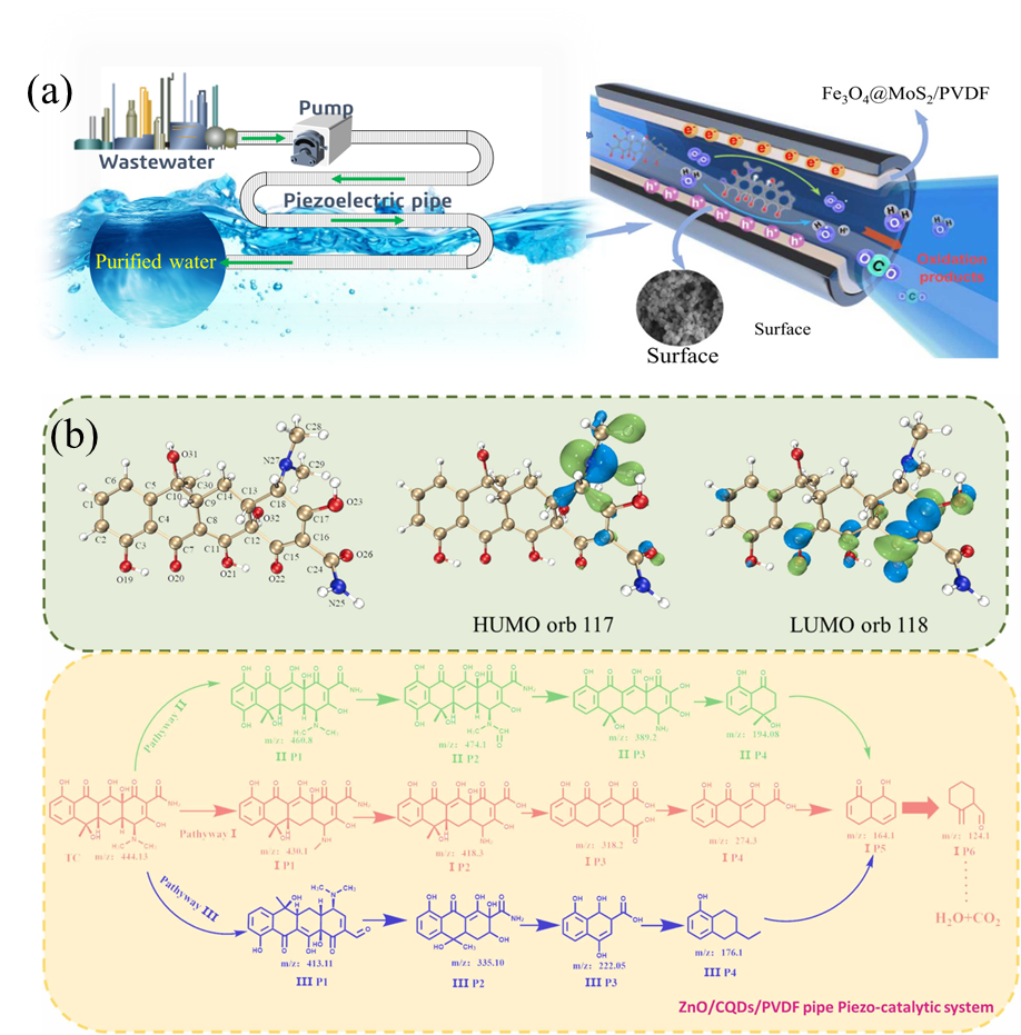 图2(a)水流动力驱动压电催化体系;(b)四环素压电催化降解途径