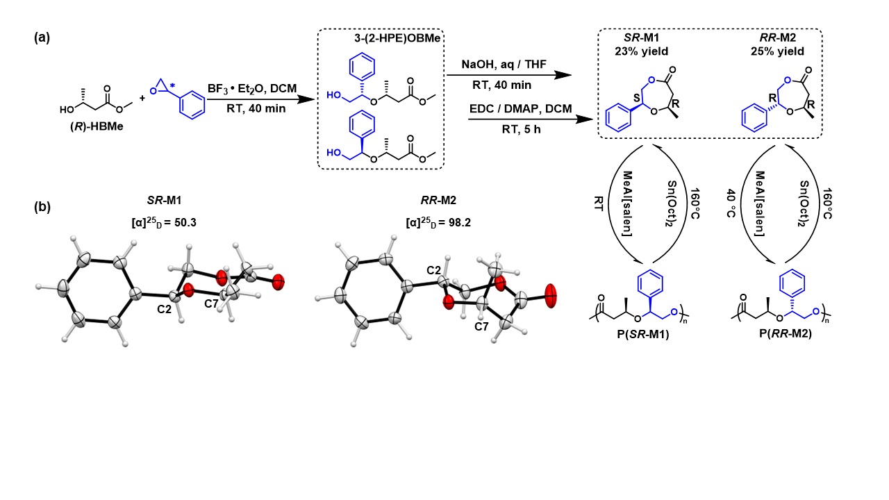 化工学院沈勇/李志波团队在之前的工作中,通过高效的化学手段,利用并环化合物实现聚(3-羟基丁酸酯)(P3HB)的升级回收将P3HB转化为了具有并环结构的可闭合回收聚醚酯(ACS Sustain. Chem. Eng. 2022, 10, 8228-8238.)。进一步将P3HB转化为光学纯双环醚酯单体,实现其可控开环聚合得到了立构规整、高熔点、可闭合循环的新型聚醚酯材料,尽管取得了进展,但是由于聚合物刚性的主链和高缠结摩尔质量仍表现出较差的力学性能(Angew. Chem. Int. Ed. 2023, e202302101)。因此,探索可循环聚醚酯的闭合回收,以及进一步研究立体构型和取代基对其热性质和力学性能的影响仍然具有科学意义。