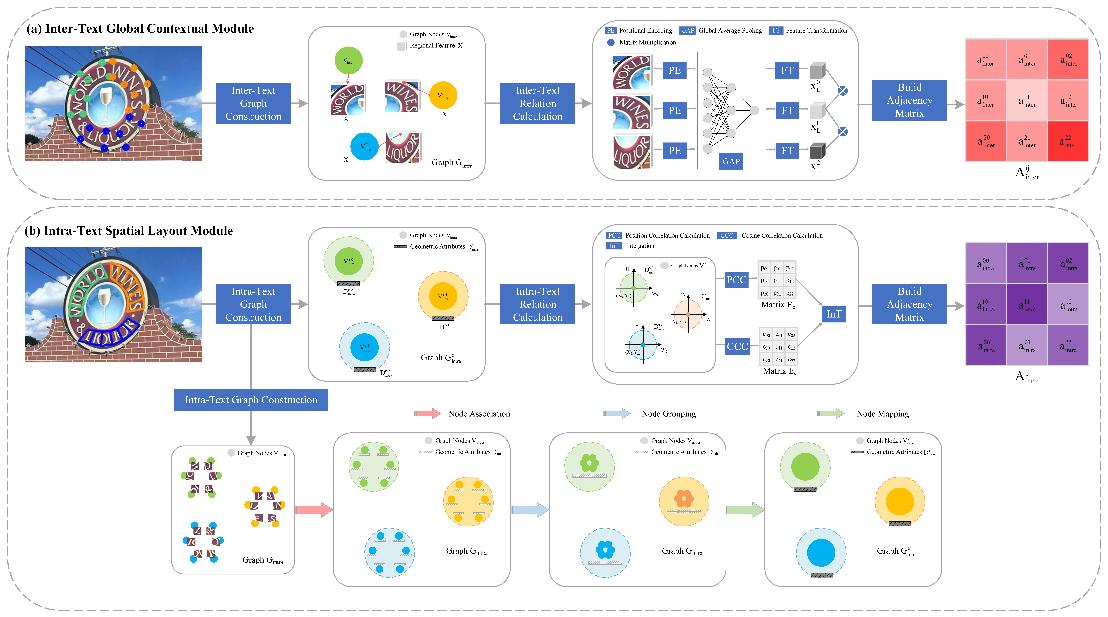 面对上述挑战,本文基于自然场景文本自身的特点,从建模多粒度文本表征形式的角度出发,提出了基于层级关系图推理网络的任意形状场景文本检测方法。相较于现有的方法,该方法利用多粒度文本推荐区域生成网络,进行单词级别和字符级别目标定位,以此构建基于视觉联系的单词级别关系图和基于几何属性的字符级别关系图,并借助分层设计实现了跨粒度间的关系传播和信息交叉馈送,从而提高了模型的鲁棒性,克服了场景文本在大规模复杂场景下的检测难点。