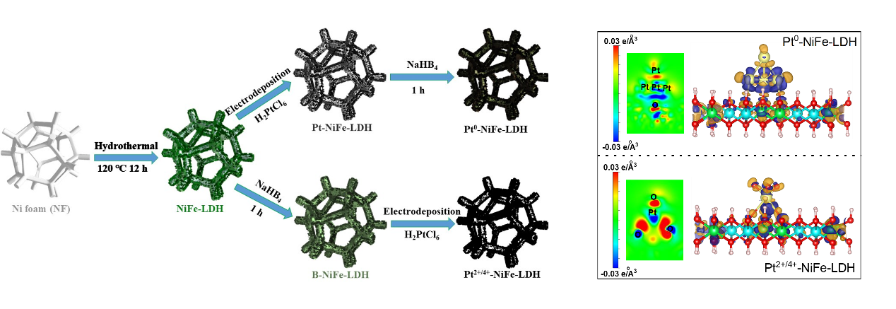 开发经济高效的阳极析氧反应(OER)和阴极析氢反应(HER)电催化剂是催化水电解的核心要素。一般认为,固体催化剂的理化性质,特别是电子结构,直接影响其表面吸附行为,从而决定活性位点的性能。载体与金属位点之间的电子转移由金属物种的费米能级与载体之间的平衡状态所决定。这种电子转移过程直接影响了金属位点中心的电荷密度和分布,从而对其催化性能产生重要的影响。