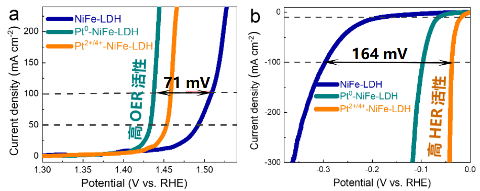 在本工作中,作者通过改变硼化和电沉积Pt种类的顺序的电子调控策略制备了不同Pt电子结构负载的镍铁层状双氢氧化物(NiFe-LDH)。通过调控Pt电子结构优化了金属-金属/金属-载体之间的相互作用,并解析了电子结构调控策略对阳极OER和阴极HER的构效关系。电化学测试表明,具有低价态Pt的催化剂(Pt0-NiFe-LDH,即先沉积Pt后硼化的催化剂B-Pt-NiFe-LDH)具有更优异的OER性能,在100 mA cm-2时过电位为208 mV,与NiFe-LDH相比,过电位降低了71 mV。而具有高价态Pt的催化剂(Pt2+/4+-NiFe-LDH,即先硼化后沉积Pt的催化剂Pt-B-NiFe-LDH)具有更优异的HER性能。在10 mA cm-2时的过电位仅有19 mV,与NiFe-LDH相比更是降低了164 mV的过电位,在大电流下性能优势更明显。这证明了Pt的电子结构对催化反应的性能产生了重要影响。