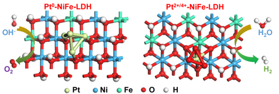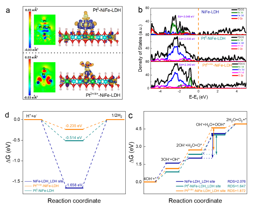 密度泛函理论(DFT)计算结果中,差分电荷密度图显示在这两个催化剂中,Pt周围有非常明显的电荷再分布;对于Pt0-NiFe-LDH,界面处的Pt有非常明显的给电子效应,而顶端的Pt有很明显的吸电子现象;对于Pt2+/4+-NiFe-LDH,由于Pt与O直接相连,O的电负性大于Pt,给电子效应更加明显。另外,可以看到两个催化剂界面处的Fe位点也有很明显的电荷迁移现象。态密度(DOS)图显示具有Pt组分的催化剂比纯NiFe-LDH在费米能级附近有更多的电子数,也证明了电子发生了重排。吉布斯自由能台阶图显示,这种电子结构调控降低了OER和HER的能垒,从而分别提高了这两种催化剂的OER和HER活性。