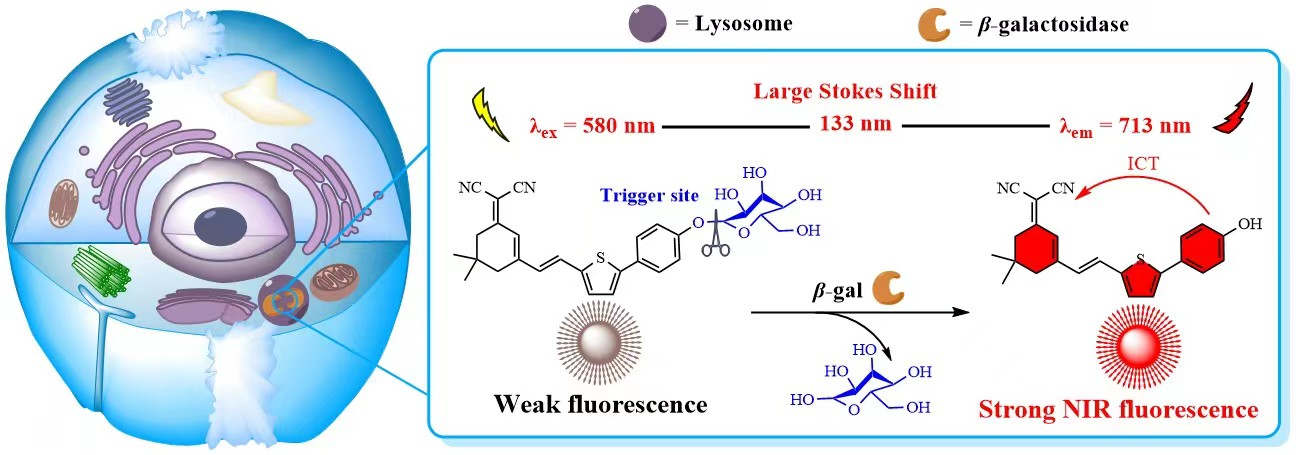 针对以上问题,海洋科学与生物工程学院王晓春教授团队长期致力于具有大斯托克斯位移,且对特定肿瘤标志物进行成像识别的近红外荧光探针开发,先后开发了能特异性监控黑色素瘤标志物酪氨酸酶(Tyrosinase)和过氧化氢(H2O2)的高灵敏、高选择性近红外荧光探针(SensorsandActuators: B. Chemical,2022,354,131211;Sensors and Actuators: B. Chemical,2023,393,134301)。在此基础上,该课题组以卵巢癌标志物β-半乳糖苷酶(β-gal)为切入点开展了系列研究工作,相关成果以“β-Galactosidase activity monitoring and bioimaging by a novel ICT mechanism-based NIR fluorescent probe with large Stokes shift”为题目发表在国际著名期刊《Sensors and Actuators B:Chemical》(JCR中科院一区Top)上(Sensors & Actuators: B. Chemical,2024,398,134696)。该论文第一作者为KY开元集团官网海洋科学与生物工程学院2021级硕士研究生高建,王晓春教授为独立通讯作者,KY开元集团官网为第一通讯单位。