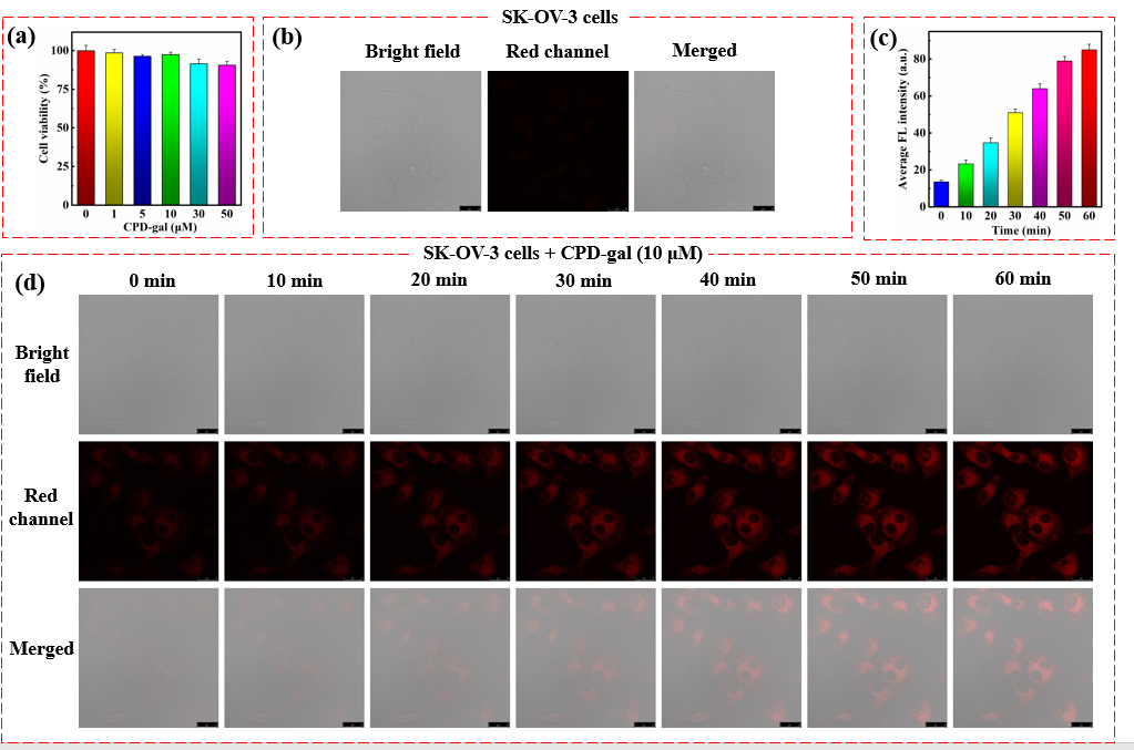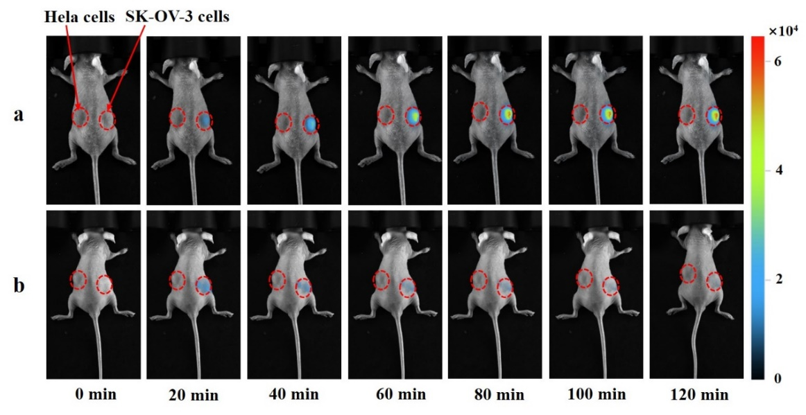 卵巢癌是威胁女性生命健康的重要疾病之一,早期的正确诊断是提高癌症治愈率的关键。已有的研究表明:β-半乳糖苷酶(β-gal)作为原发性卵巢癌的重要生物标志物,是卵巢肿瘤可视化的重要分子靶点。我们以双氰异佛尔酮衍生物CPD-OH为荧光母体,连接上半乳糖苷酶残基构建用于β-半乳糖苷酶(β-gal)识别的荧光探针分子CPD-gal。该探针母体CPD-OH具有较高的荧光量子产率(ФF= 0.31),基于ICT机理构建的探针CPD-gal本身荧光淬灭,与β-半乳糖苷酶作用后,显示出明显的荧光增强效应。该探针具有近红外发射(lem= 713 nm)、抗干扰能力强、灵敏度高(LOD = 6.0 ×10-4U/mL)、斯托克斯位移大(133nm)和细胞毒性低等优点。利用该探针,我们成功实现了活体细胞(Hela cells和SK-OV-3 cells)和小鼠体内的内源性或外源性β-半乳糖苷酶的高分辨活体成像,为卵巢癌等疾病的早期诊断提供了有效手段。