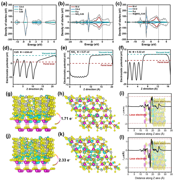 光催化实验表明最优的Ni@NiSx-CdS光催化剂表现出优异的分解水制氢性能,其产氢速率达到78.7 mmol·g−1·h−1,且经长时间连续多次重复使用后仍保持良好的活性。理论计算证明Ni@NiSx-CdS中的Ni团簇、NiSx和CdS之间具有紧密的异质界面,有利于界面间的电荷传输。此外,Ni团簇的嵌入使得三者间存在梯度功函数的变化,为电子在界面间的流动提供驱动力,进而诱导活性硫位点p带中心下移,优化了活性硫位点与中间体H*之间的相互作用,降低H*吉布斯自由能(ΔGH*)。