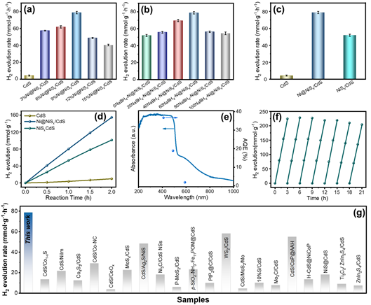 光催化分解水可以将太阳能转化为可储存的氢气,有望使人类摆脱对化石燃料的依赖。硫化镉(CdS)由于具有良好的可见光响应和合适的带隙,被认为是一类极具应用潜力的光解水制氢催化剂。然而,单一CdS由于受限的载流子分离动力学以及迟缓的界面析氢动力学,其光催化制氢性能并不令人满意。助催化剂修饰可显著增强CdS的制氢活性,这是因为助催化剂可提供丰富的析氢活性位点。根据Sabatier原理,理想的活性位点对中间物H*吸附力既不能太强也不能太弱。遗憾的是,目前开发的助催化剂,特别是非贵金属助催化剂,由于其不合适的电子结构,导致活性位点对H*的吸附过强或者过弱,严重限制了助催化剂的析氢活性。因此,优化活性位点与H*的键能是提高光催化剂析氢效率的关键。