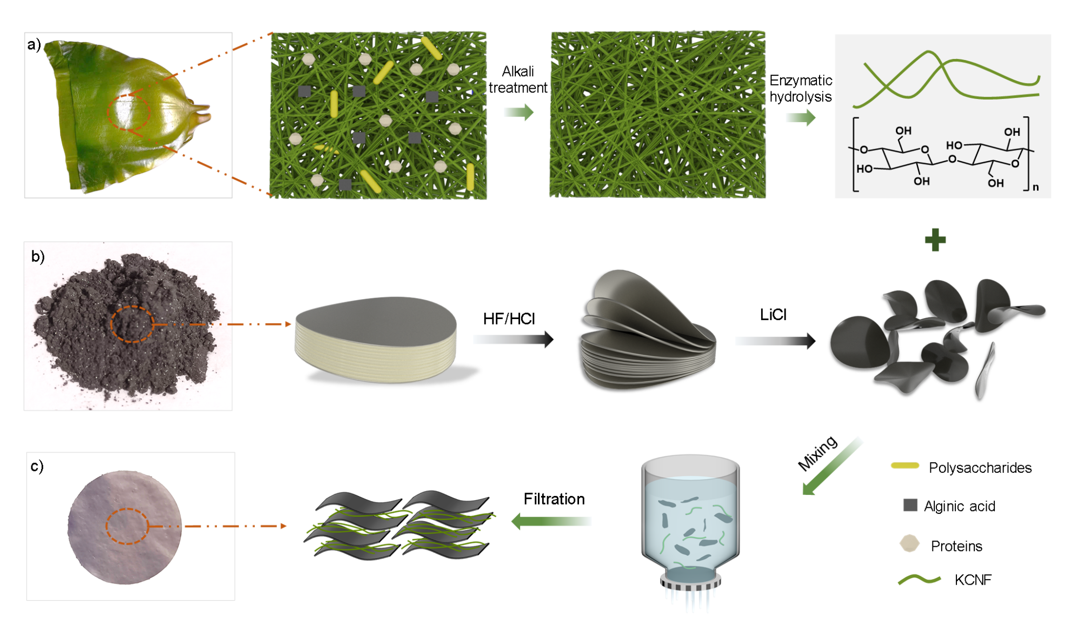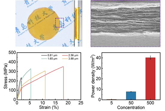 同时,考虑到合成纤维的成本昂贵、不易获得等弱点,为此,滕超副教授将目光投向自然界,寻找一种生长周期短、储量丰富、易于获得的天然海带,将提取的带负电海带纳米纤维与MXene纳米片复合,制备力学性能提高、溶液稳定的KCNF/MXene纳米复合材料,实现高效盐差能量捕,相关工作以题为“Kelp Nanofiber-Based Composite Membranes for Highly Efficient Osmotic Energy Conversion”的研究性论文发表在国际著名期刊Advanced Functional Materials上(2023,DOI: 10.1002/adfm.202313914,accepted)。KY开元集团官网材料学院2021级硕士研究生翟瑞为本文的第一作者,滕超副教授为通讯作者。