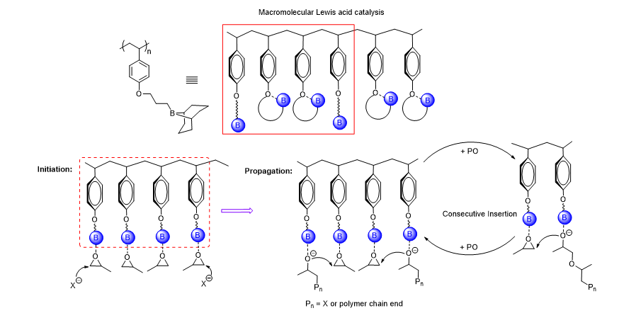 化工学院王晓武/李志波教授团队最近提出了“聚集诱导放大效应”的概念,通过在大分子尺度范围内,将多个硼烷通过化学键整合到聚合物主链上,多硼中心的聚集和聚合物链的空间限域效应,使得制备的大分子硼路易斯酸对水氧具有高度耐受性。利用硼烷与单体、活性种的多重协同作用,实现了环氧单体的高效均聚制备聚醚多元醇及共聚合制备CO2基聚碳酸酯。