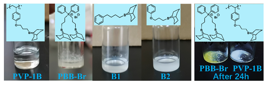 大分子硼路易斯酸的合成路线如图1所示。通过商品化的聚(4-乙烯基苯酚),经过两步法合成了大分子硼催化剂PVP-1B,通过“空气中静置实验”证明PVP-1B具有很好水氧稳定性。将PVP-1B的高耐水氧稳定性归因于以下几个因素: (1)硼和氧的超分子相互作用:这些相互作用有助于PVP-1B的紧密分子结构,减少了硼原子暴露于水分和氧气中机率,进而减少了氧化或水解反应的可能性。(2)较大的分子尺寸:大分子硼的结构因其较大的分子尺寸和体积,阻碍了水分和氧气扩散到聚合物溶液中,并限制了它们与硼烷单元的相互作用。(3)疏水性:PVP-1B表现出疏水性(不溶于水),进一步降低了水解反应的可能性。此外,硼烷中心的空p轨道与苯环的超分子相互作用对PVP-1B稳定性可能具有一定的贡献。