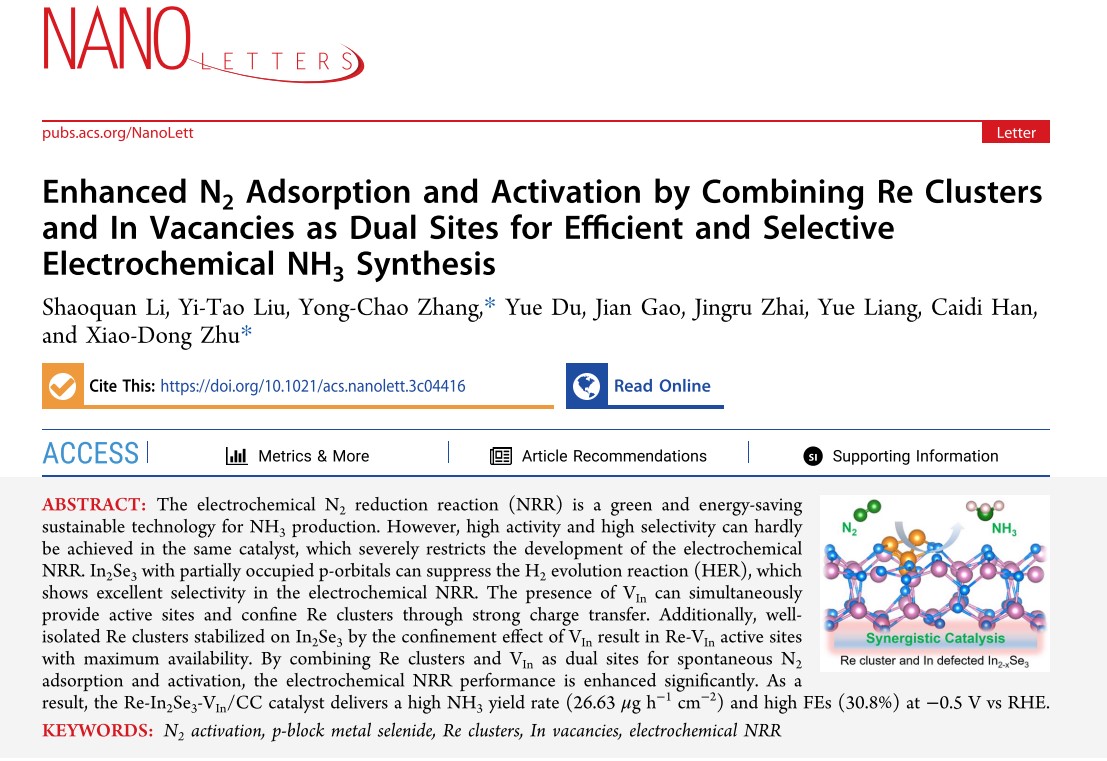 近日,化工学院张永超副教授、朱晓东教授团队在电催化固氮领域取得新进展,相关成果以“Enhanced N2Adsorption and Activation by Combining Re Clusters and In Vacancies as Dual-Sites for Efficient and Selective Electrochemical NH3Synthesis”为题发表在国际知名期刊《Nano Letters》(影响因子10.8,中科院1区)论文第一作者为2021级博士生李少权,通讯作者为张永超副教授与朱晓东教授。KY开元集团官网为第一作者及唯一通讯作者单位。