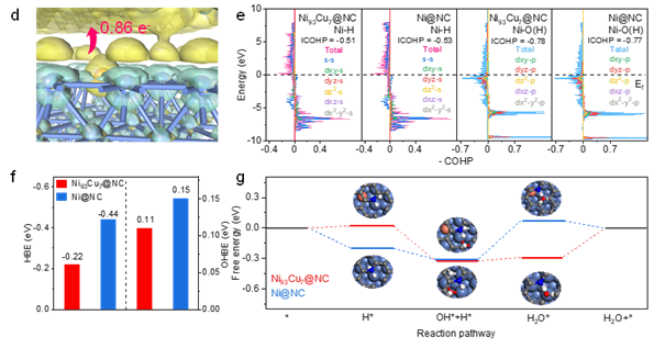 在该工作中,研究人员报道了一种通过原位纳米粒子-配体组装低温碳化策略可控合成氮掺杂碳壳包覆的NiCu纳米颗粒。所制得的Ni93Cu7@NC催化剂核心为Ni和金属间化合物Cu3.8Ni异质结构。该催化剂具有优异的HOR活性及稳定性,是目前最先进的Ni基HOR催化剂之一。在AEMFC中,电池可以提供高达381 mW cm-2的峰值功率密度。实验和理论研究表明,NiCu核和氮掺杂碳界面处电子的重新分布减少了s-s成键轨道和dz2/yz-p反键轨道的电子占据,从而优化了氢结合能(HBE)和氢氧结合能(OHBE),Ni93Cu7@NC催化剂催化HOR所需热力学能量最低。