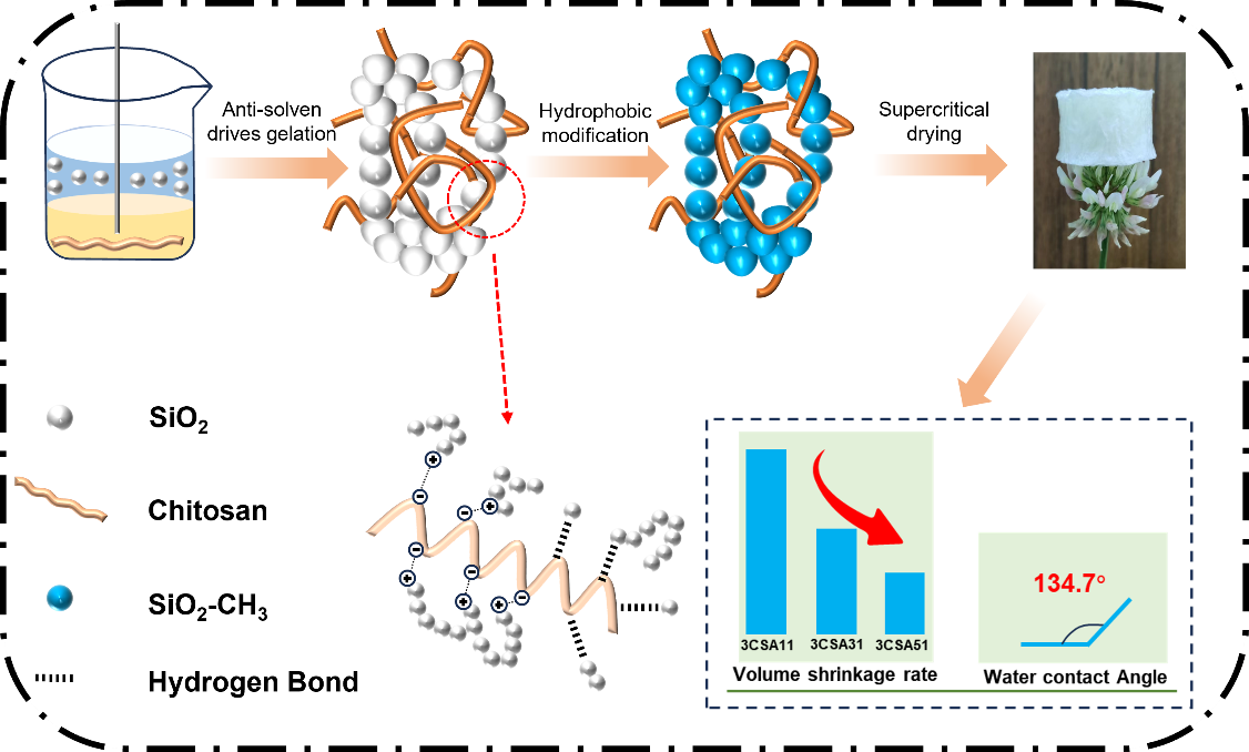 研究结果表明,通过改变复合系统的组成比例(从SA:CS = 1:1到5:1),体系的凝胶时间缩短了12倍以上,复合气凝胶的干燥收缩率达到了最小值7.6%。在两组分重组过程中,壳聚糖在乙醇的影响下迅速形成了水胶体的次级结构。这种现象降低了系统的稳定性,使二氧化硅形成了两相复合水凝胶。由于纤维之间的网络间隙被用作限制凝胶生长的介质,因此形成了具有低密度(0.1144 g/cm³)和介孔结构的壳聚糖/二氧化硅复合气凝胶。在30℃时,复合气凝胶的热导率为0.028 W/(m·K)。三甲基氯硅烷使复合气凝胶具有良好的疏水性,水接触角为134.7°,四氯化碳的吸附量可达到自身重量的10倍以上。