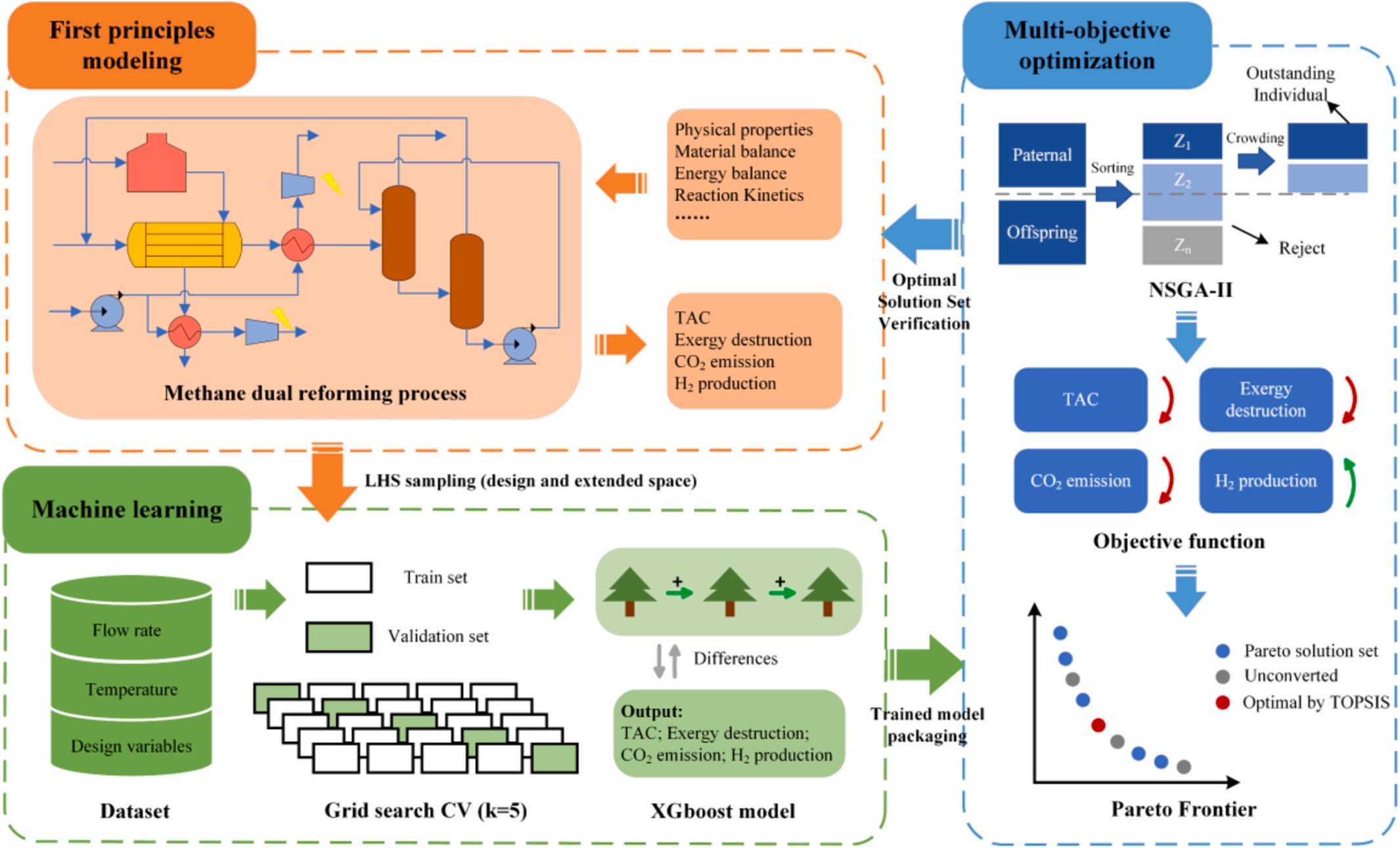文章分别提出了基于复合载氧体选择的生物质化学链气化过程多尺度优化策略(如图1)、基于机器学习代理模型构建的甲醇重整过程多目标优化策略(如图2)、基于流程建模与智能筛选的煤焦油化学链气化动态优化控制策略、基于动态模拟与深度学习的煤制乙二醇过程废水智能溯源策略及基于流体力学建模的火炬气回收工艺优化设计策略。采用分子模拟与流程模拟、理论计算与实验测试的多尺度、多策略的新型融合式研究手段,旨在实现复杂化工过程的平稳高效运行。以上5篇文章均以KY开元集团官网为第一单位,田文德教授、刘彬讲师分别为论文的通讯作者,崔哲副教授、博士研究生刘子健、博士研究生李哲、硕士研究生孙阳、硕士研究生范晓敏分别为论文的第一作者。