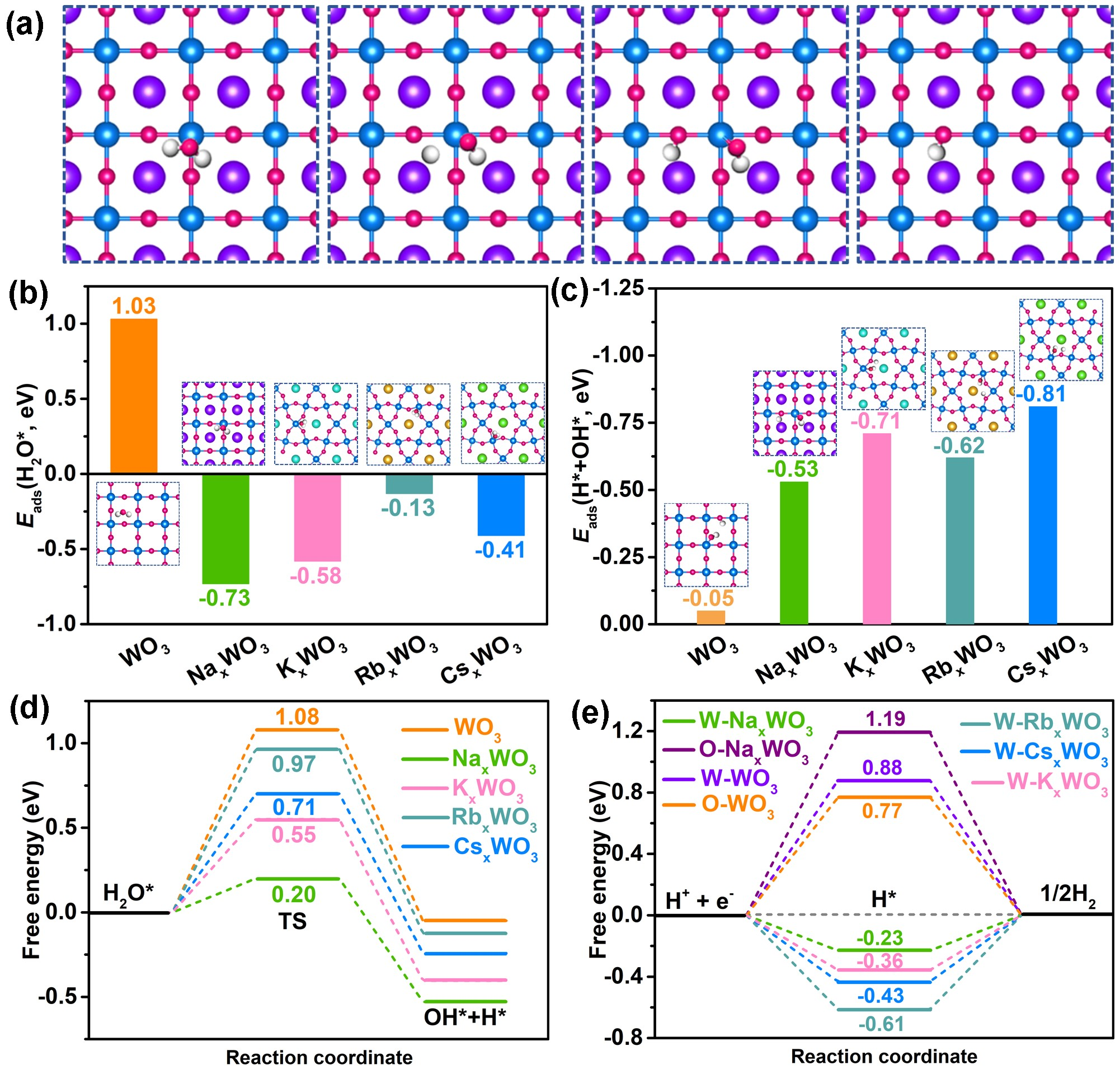 为满足各种电解槽对不同类型电解质的应用需求,设计开发能够在宽pH范围内具有优异析氢活性和稳定性的非贵金属电催化剂具有重要意义。最近,本团队首次开发了一种新型高效的非贵金属基全pH析氢催化剂——钠钨青铜多孔八面体(图1)。该催化剂能够在酸性、碱性和中性海水电解质中均具有类似商业铂碳催化剂的析氢活性,在10 mA cm-2时的过电位仅分别为37、48和256 mV(图2)。DFT计算表明,Na离子的引入使NaxWO3具有最优的电子结构和金属导电性,进而促进了水的吸附/解离动力学和氢吸附自由能(图3)。该工作首次揭示了碱金属离子在钨青铜中电催化析氢反应中的作用机理,有望为析氢反应和其他能量储存与转化反应催生一类新的非贵金属催化剂。上述成果发表于国际知名期刊Nano Energy(中科院1区TOP期刊,影响因子16.7),刘光波副教授为论文第一作者,姜鲁华教授为论文通讯作者,KY开元集团官网为论文第一完成单位。