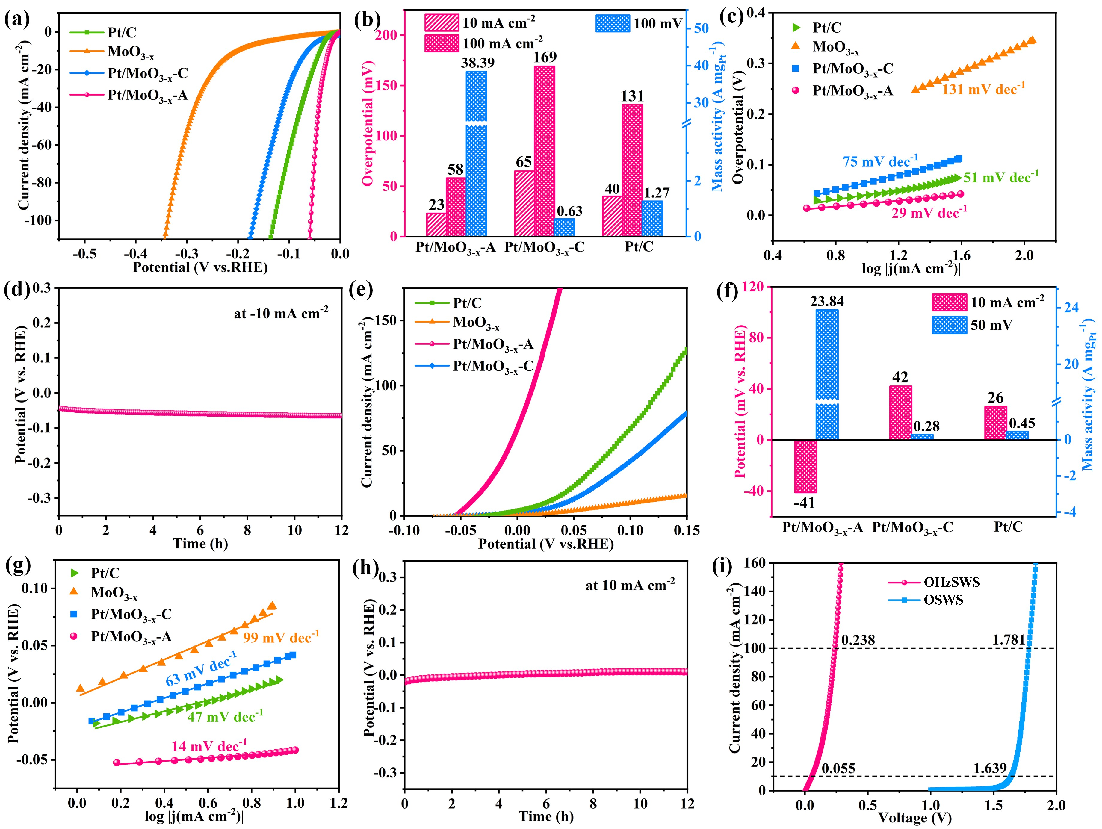 图5晶态/非晶态Pt/MoO3-x的肼氧化辅助电解海水制氢性能