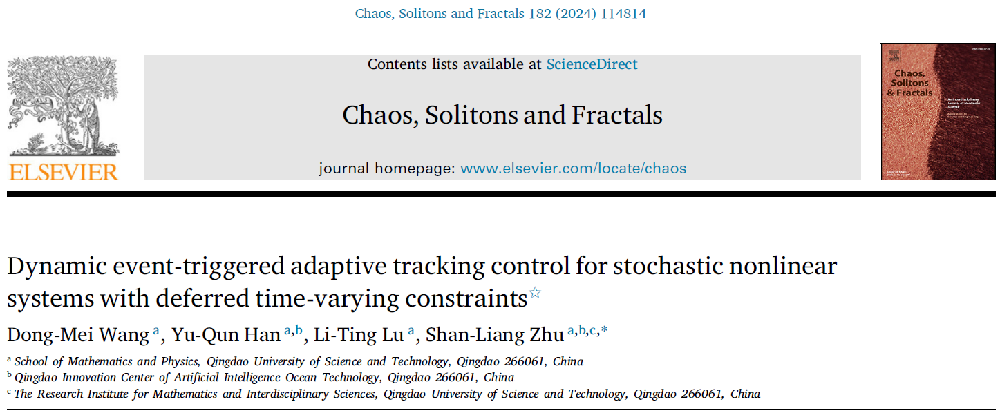 近日,数理学院朱善良和韩玉群团队在智能控制领域取得新进展,相关成果以“Dynamic event-triggered adaptive tracking control for stochastic nonlinear systems with deferred time-varying constraints”为题发表在国际著名期刊Chaos, Solitons and Fractals(中科院数学1区,影响因子7.8)。朱善良副教授为本文的通讯作者,数理学院硕士研究生王冬梅为第一作者。该研究KY开元集团官网为第一通讯单位,获得了山东省自然科学基金项目的资助和支持。文章链接:https://doi.org/10.1016/j.chaos.2024.114814.