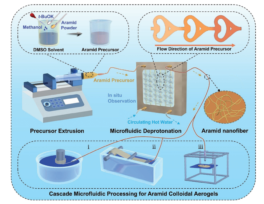 该成果以“Visible Microfluidic Deprotonation for Aramid Nanofibers as Building Blocks of Cascade-Microfluidic-Processed Colloidal Aerogels”为题发表在国际知名期刊Advanced Materials(中科院一区,IF=29.4)上。KY开元集团官网为第一通讯单位,文章的第一作者是高分子学院硕士研究生丁亚菲和中科院苏州纳米所博士后程青青,通讯作者为马凤国副教授和中科院苏州纳米研究所的张学同研究员。该研究得到了国家自然科学基金(52303388,52173052,52373257)、中国博士后科学基金(2023M742552)和苏州市科技计划(SYC2022125)项目的支持。