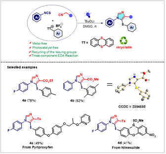 咪唑环作为常见和重要的五元N杂环之一,是有机化学中重要的结构砌块。其中,硫代多取代咪唑作为重要的咪唑衍生物存在于许多药物和生物活性分子中。因此,寻找简单、高效合成含硫多取代咪唑类化合物的方法具有重要意义。目前,可见光促进的EDA(electron donor and acceptor)活化策略是有机合成领域的研究热点,然而该方法大多集中于双分子之间的反应,多组分EDA活化策略由于受各组分之间的干扰影响,其研究仍具有较大的挑战,相关报道较少。