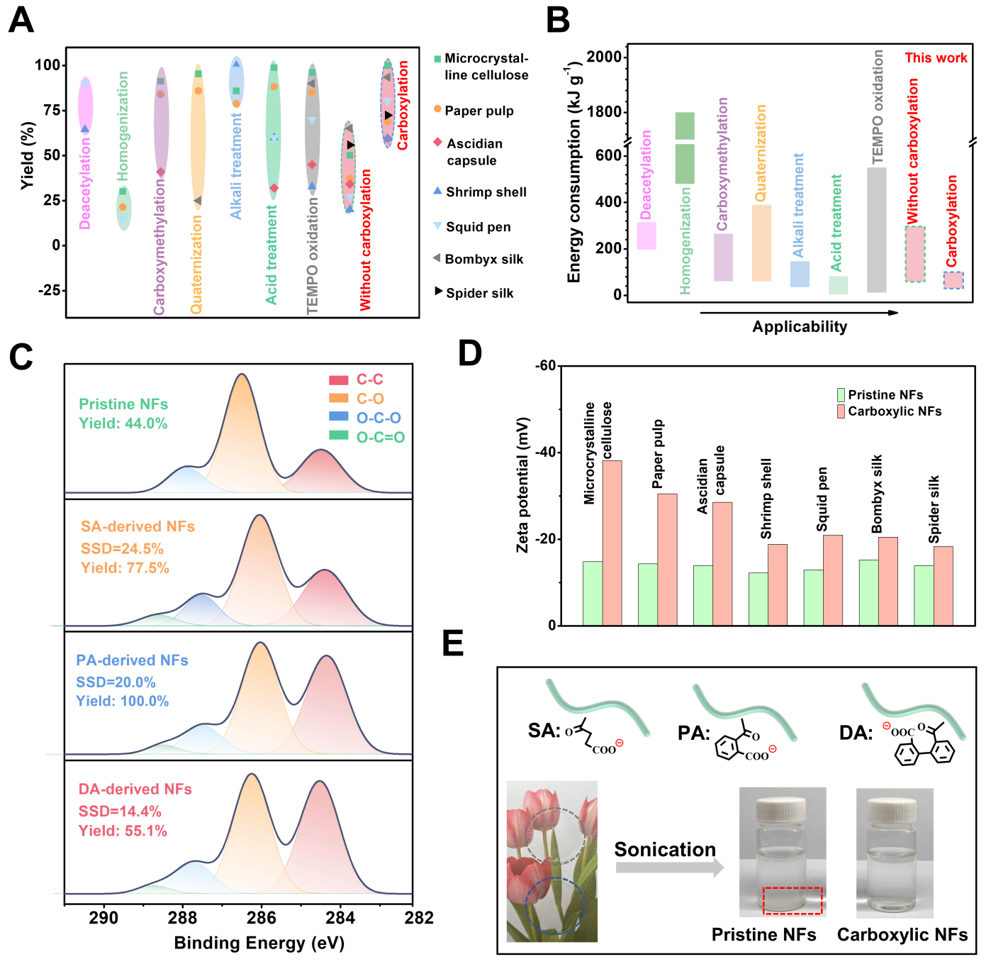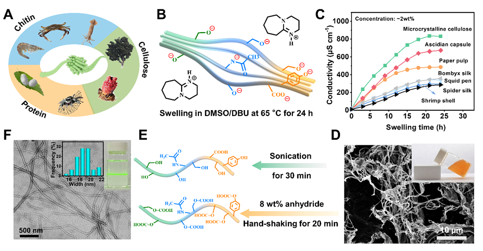 近日,KY开元集团官网张建明团队陈玉伟副教授与中国科学院青岛能源所李朝旭研究员等合作开发了一种具有普适性的生物质纳米纤维绿色制备方法。该制备方法主要利用1,8-二氮杂双环[5.4.0]十一碳-7-烯(DBU)的二甲亚砜(DMSO)作为一种通用的、可回收的、非侵入性的去质子化溶剂体系,对不同多糖或氨基酸基生物质材料进行夺质子化处理,并配合后期高压均质等强物理剪切作用制备生物质纳米原纤维。同时,依赖于DBU的酯化催化特性,该溶剂体系还可以活化生物质表面羟基,促进其与酸酐反应制备羧基化纳米纤维。