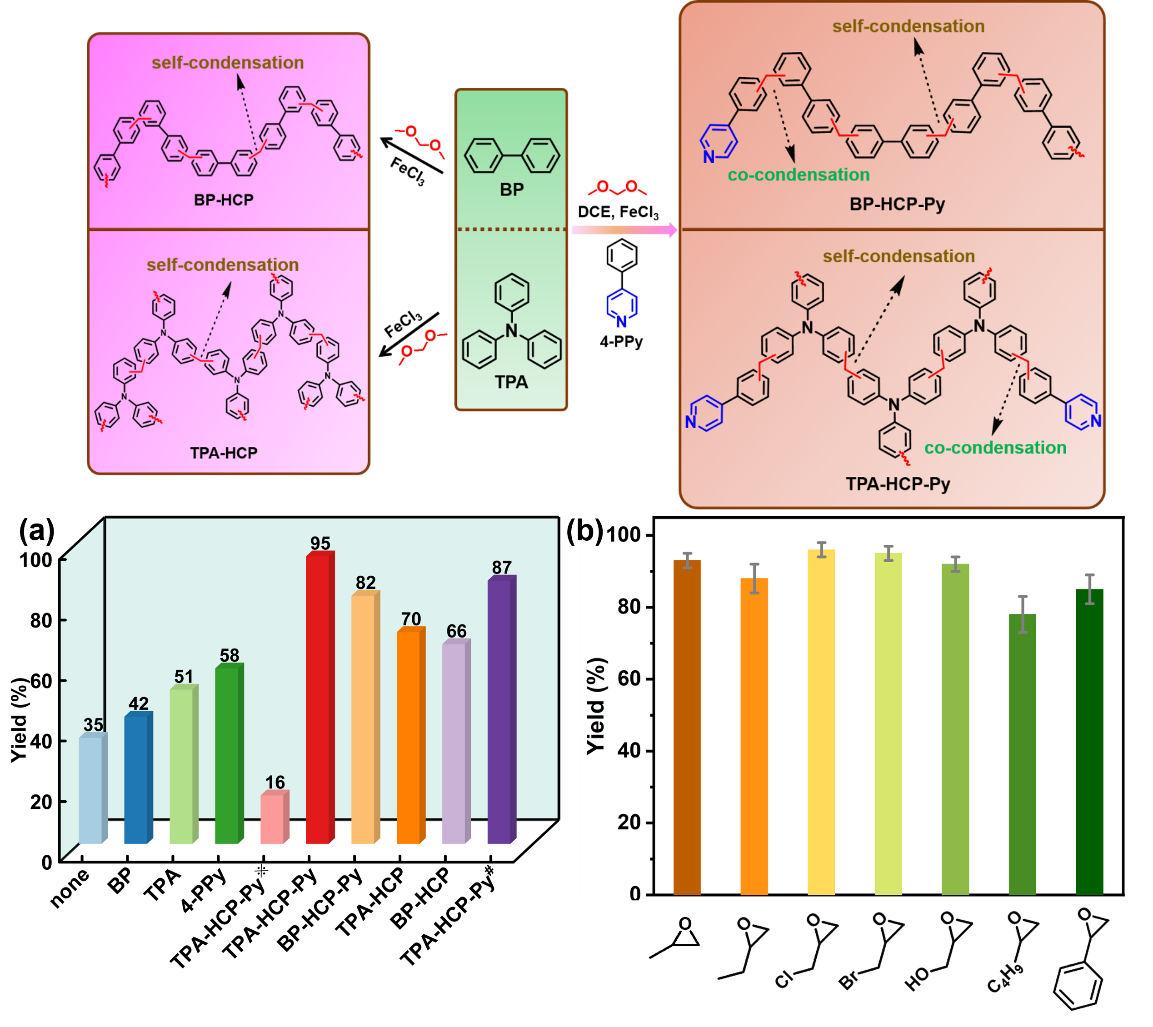 结合密度泛函理论(DFT)计算的方法,作者深入阐明了不同活性位点与模型反应物的相互作用以及新型催化微环境下CO2与环氧化物环加成反应机理,为功能导向新型催化材料的设计与开发提供了重要指导。该工作解决了当前多相催化剂存在的稳定性差、催化活性低导致的反应需要高温高压等问题。以上研究成果以“Experimental and theoretical investigation of phenylpyridine-based hypercrosslinked polymers for atmospheric CO2adsorption and fixation under solvent-/metal-free conditions”为题发表于国际化工三大刊的Chemical Engineering Science,论文链接:https://doi.org/10.1016/j.ces.2024.120298。KY开元集团官网化工学院2022级硕士研究生曲添添为第一作者,刘猛帅与刘福胜为论文共同通讯作者,KY开元集团官网为第一通讯单位。