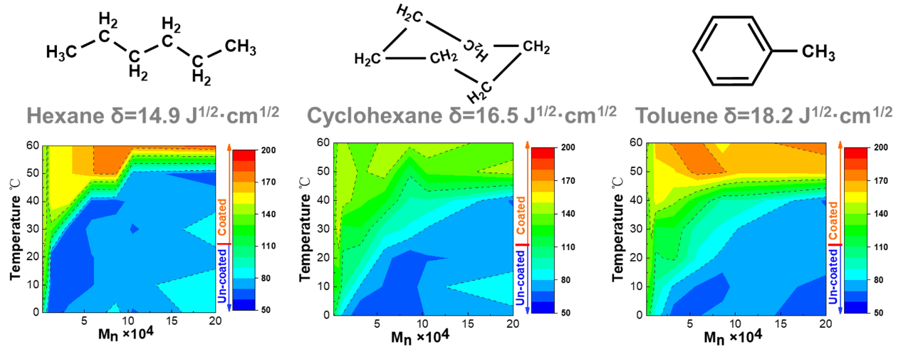 不同分子量聚丁二烯在不同温度下的不同溶剂中包覆后的粒子粒径