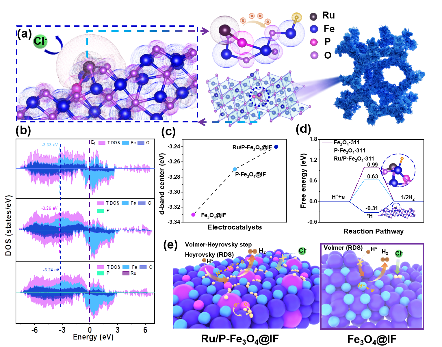 图2.Ru/P-Fe3O4@IF材料的反应理论计算和HER机制图。