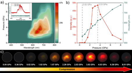 有机发光材料结构丰富、分子设计灵活、性能优异,一直是材料领域研究的焦点。如何提升固态荧光效率是有机发光材料研究的重大科学问题。压力作为独立的热力学参量,能够有效调控分子间相互作用,进而获得新结构和新性质。高压诱导发光(pressure-induced emission,PIE)这一新奇现象就是典型范例,能够通过高压实现不发光材料“从无到有”的荧光激活,为探索新型发光材料提供了有效途径。遗憾的是,在有机材料中实现“从无到有”PIE的研究尚属空白。对此,研究者选取偶氮苯分子开展了研究。偶氮苯具有独特的光致顺反异构特性,被广泛应用于智能材料领域。但光致异构与辐射跃迁竞争激发态能量,从根本上严重限制了偶氮苯的发光性能。如何实现偶氮苯高效发光一直是公认的科学难题。