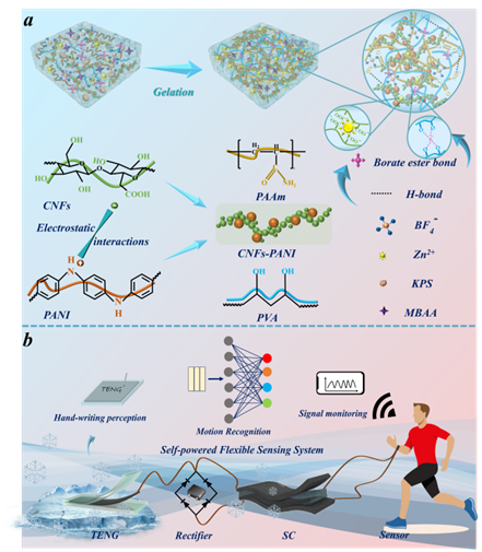 高机械强度、坚韧和抗疲劳性对于提升导电水凝胶在自供电传感系统中的可靠性至关重要。然而,要同时实现这些互斥的性能仍然具有挑战性。近日,KY开元集团官网高传慧、武玉民教授团队提出了一种基于拓扑网络结构和力学训练的新型定向互锁策略,通过优化网络结构和调节分子链取向,成功构建出一种具有优异机械性能的多功能导电水凝胶。值得强调的是,定向导电通路的构筑显著增强了水凝胶的导电性能,从而提高了自供电器件的输出效率。得益于多重可逆效应,受损的水凝胶能够实现快速而高效的自我修复;同时,氟原子与水分子之间的强相互作用赋予了水凝胶优异的抗冻特性。当前所开发的自供电系统已展示出广泛的实际应用潜力,这为多功能水凝胶材料提供了新的应用前景。