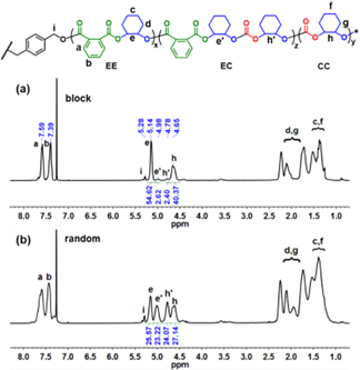图3.嵌段聚(PA-alt-CHO)-b-PCHC(a)和无规聚(PA-alt-CHO)-ran-PCHC(b)的1H NMR谱图