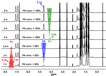 图2. P5Cl/TEB(1/0.5)催化CHO/PA/CO2一锅/一步三元共聚不同反应时间下聚合粗产物1H NMR谱图