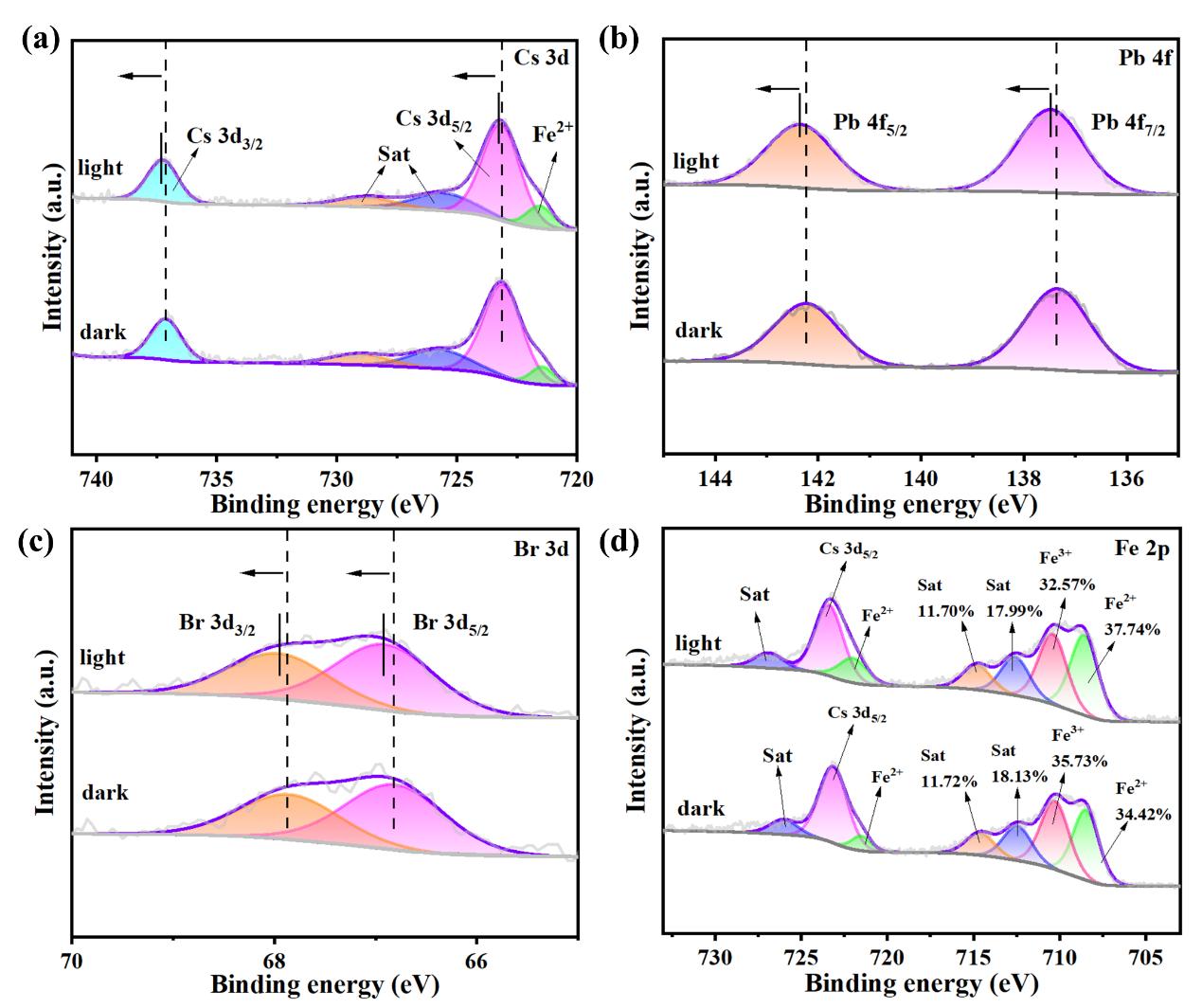 LFP/CPB QDs在黑暗和光照条件下的XPS光谱分析:(a)Cs 3d,(b)Pb 4f,(c)Br 3d和(d)Fe 2p
