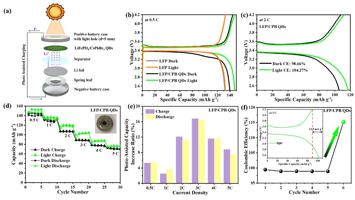 (a)开孔电池装置;LFP和LFP/CPB QDs在黑暗和光照条件下,(b)0.5 C倍率和(c)2C倍率的恒电流充放电曲线;(d)LFP/CPB QDs在0.5 C至5 C倍率下,黑暗和光照条件下的速率性能;(e)LFP/CPB QDs在充放电过程中的光辅助容量增加;(f)LFP/CPB QDs在黑暗和光照下的库伦效率