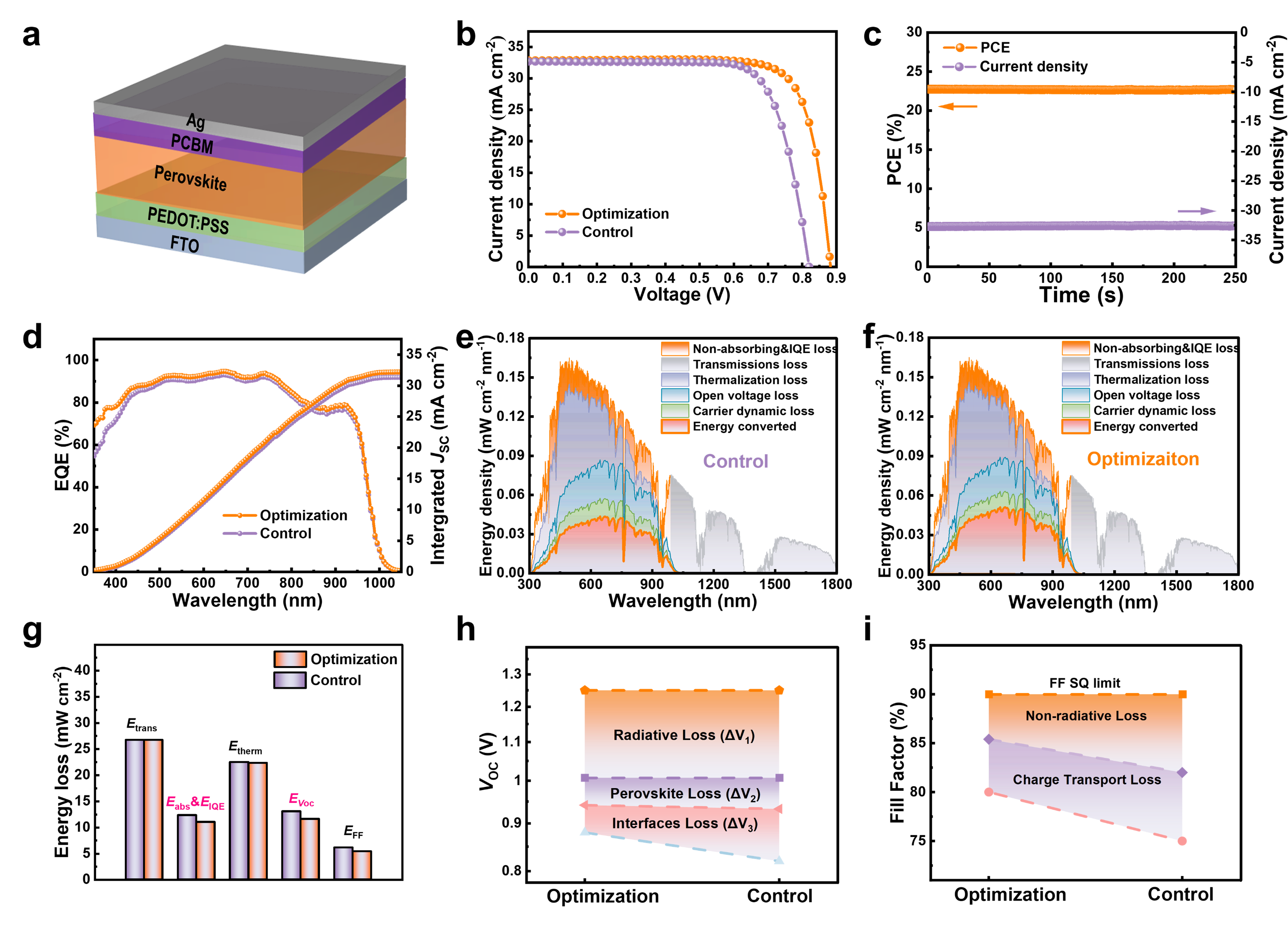 综上所述,该项工作开发了一种策略,通过引入FPD构建电场,从而通过场效应钝化抑制界面处的非辐射复合,从而减少了多界面引起的QFLS损失,并最大限度地提高了PSCs的VOC。FPD的掺入在钙钛矿/ETL界面附近构建了一个增强的电场,促进了载流子的分离和传输,并扫除了界面电荷积累,从而有效地抑制了非辐射复合。此外,通过引入FPD来调节钙钛矿结晶,钙钛矿表面的能量无序减少了。结果,获得了PCE为23.44%且VOC为0.88 V 的高性能钙钛矿器件。此外,优化后的器件具有出色的极化稳定性和高离子迁移活化能,因此表现出优异的长期稳定性。优化后的装置在氮气环境下3000小时后仍保持90%的原始效率,在连续光照的MPP运行 1100小时后仍保持88%的初始值。这项工作中调节电场的策略有助于探索高效稳定的PSC。