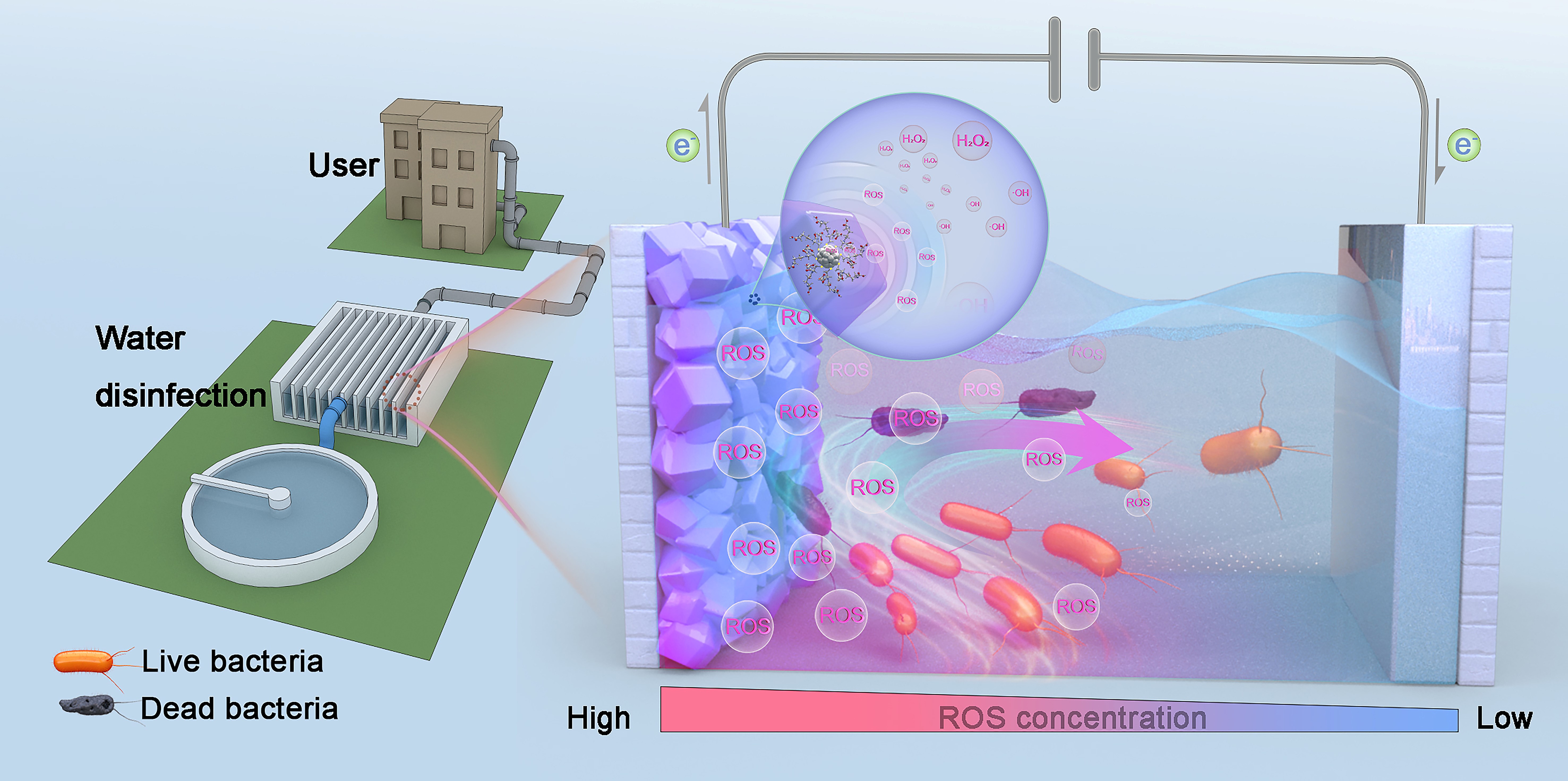 近日,KY开元材料学院袁勋团队在自然子刊《Nat. Commun.》上发表了题为“Simultaneous generation of residue-free reactive oxygen species and bacteria capture for efficient electrochemical water disinfection”的研究论文。面对日益严峻的全球水资源安全挑战,该团队在电化学水消毒系统方面取得突破进展:开发了一种搭载原子级精确Ag28纳米团簇电极的电化学水消毒技术,实现了高效、连续、无残留的水体消毒。通过理性设计Ag团簇基电极材料,可提供1)大量的细菌电吸附位点,用于智能细菌富集;2)Ag团簇可原位生成局部高浓活性氧(ROS),结合银本身的本征抗菌特性实现双机制细菌灭活;3)基于电化学水消毒系统的“活死细菌迭代”(即活细菌吸附→细菌灭活→死细菌脱附)效应,实现该系统的连续水消毒。实验表明,该电化学水消毒系统对革兰氏阳性菌、革兰氏阴性菌及真菌均具有超过99.99%的杀菌率,且经过40次循环使用性能仅下降0.75%,连续运行5小时以上仍可维持99.90%的抗菌效率。此外,该系统还具有低能耗、高处理通量及高环境耐受能力等特点。这项研究不仅显著提升了饮用水消毒技术的效率与可靠性,还为全球范围内的水质安全问题提供了全新的解决思路。