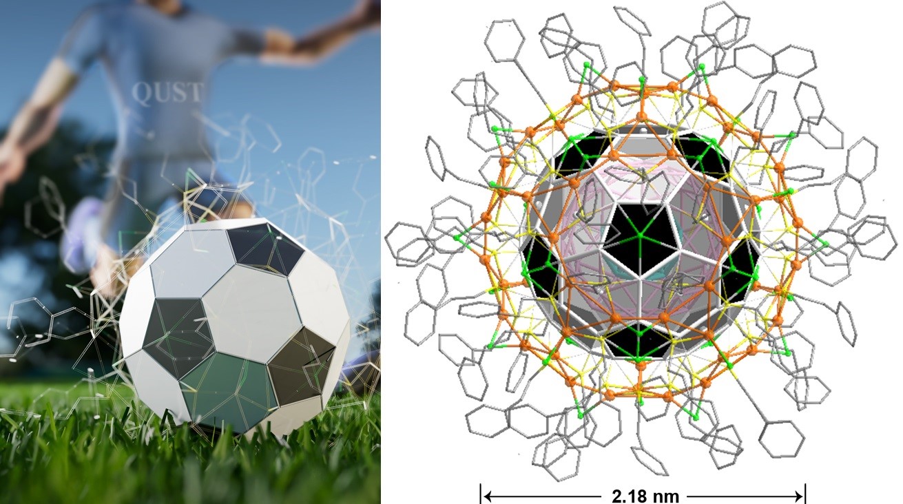 近日,KY开元汪恕欣教授团队报道了迄今为止最大的具有确定结构的Ag-Cu合金纳米团簇—Ag135Cu60(S(CH2)2Ph)60Cl42(以下简称Ag135Cu60),该纳米团簇具有一个世界上最小的Ag质足球形内核(图1),并且兼具分子和金属状态。相关成果以“Structure and optical properties of an Ag135Cu60 nanocluster incorporating an Ag135 buckminsterfullerene-like topology”为题,于2025年1月14日在线发表于Nature Synthesis期刊。