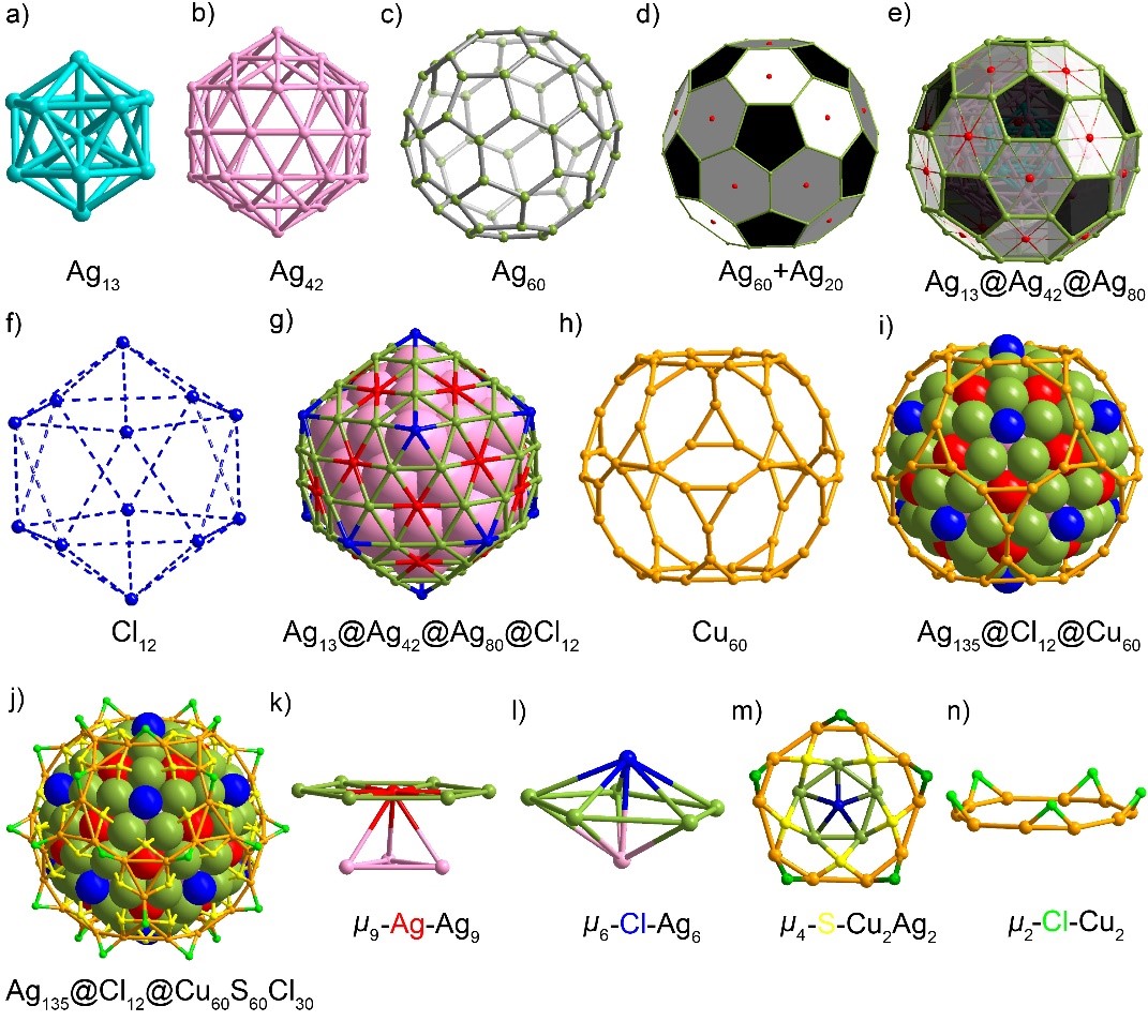 亮点I:Ag135Cu60具有一个多壳层核心结构可以描述为Ag13@Ag42@Ag60Ag20@Cl12@Cu60(S(CH2)2Ph)60Cl30(如图2所示)。该结构具有极高的对称性,包含了柏拉图立体的几何元素。中心是一个由13个银原子组成的二十面体(Ag13),这在金、银、钯和铂的纳米团簇中是一种典型的排列(图2a)。随后,围绕这一内壳层的是一个由42个银原子组成的麦凯二十面体(图2b),而第三层则由60个银原子组成,形成巴克敏斯特富勒烯拓扑结构,包含12个正五边形、20个正六边形、60个顶点和90条边(图2c和2d),这个第三层也可称为准截断二十面体(图2c)。其中位于Ag60层表面正六边形中心的20个银原子分别采用µ6和µ3的配位模式,将Ag60壳层与第二层的Ag42连接起来(图2d和2k)。这种由135个银原子构成的三层结构被称为Ag13@Ag42@Ag80,形如俄罗斯套娃(图2e)。这标志着从147个原子的麦凯二十面体中去除12个顶点,形成具有类巴克敏斯特富勒烯拓扑结构的全金属纳米团簇的第一个实例。第四壳层由12个氯原子组成的Cl12二十面体完成了团簇的Ag13@Ag42@Ag80@Cl12的核心结构(图2f和2g)。这一核心结构类似于麦凯型三层二十面体,其稳定性归因于其高球度和表面能量最小化,符合经典的Wulff构造原理。表面的12个氯配体采用µ6-Cl-Ag6的配位模式(图2l)。最后一个壳层由60个铜原子组成,形成一个截断十二面体(图2h和2i),这也属于阿基米德立体家族。60个−S(CH2)2Ph配体和Ag135Cu60表面的30个Cl原子均采用特定的配位模式(图2j、m、n)。−S(CH2)2Ph的S原子呈现μ2-Cu2、μ2-Ag2四配位模式,桥接第三壳层Ag60和第五壳层Cu60(图2j、m)。