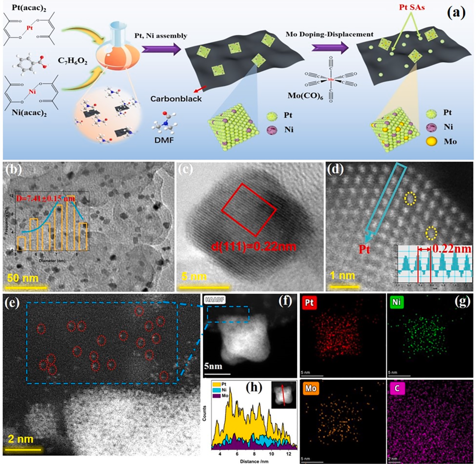 在电催化析氢领域,硕士研究生刘倩将Pt单原子(Pt SAs)和Mo原子整合到PtNi/C中,成功合成了Pt单原子/Mo掺杂PtNi八面体/碳载体催化剂(Pt SAs/Mo-PtNi/C)。研究发现,Mo原子被掺入PtNi合金八面体结构中并置换部分Pt原子,形成Mo-PtNi八面体。并且,被置换的Pt原子能够附着于碳基底表面,形成Pt单原子(Fuel381 (2025) 133356)。硕士研究生蒋璐璐提出一种简单的一体化自组装方法,成功合成了核壳结构PtNi合金@Ni(OH)₂薄膜电催化剂(PtNi@Ni(OH)2)。在PtNi@Ni(OH)2中,核壳结构的PtNi合金纳米颗粒均匀分布于Ni(OH)2薄膜上。由于PtNi合金与Ni(OH)₂之间显著的协同作用,所制备的PtNi@Ni(OH)₂在仅9 mV的极低过电位下即可实现10 mA cm⁻²的HER电流密度。(Fuel380 (2025) 133088)。