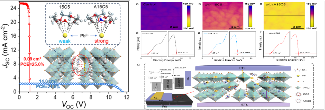 近日,化工学院蒋晓庆副教授与洛桑联邦理工学院Michael Graetzel教授、中科院青岛生物能源所逄淑平研究员、新加坡国立大学魏明杨教授等研究人员合作,以KY开元集团官网为第一通讯单位于Angewandte Chemie International Edition刊发主客体复合物中定制的超分子相互作用用于高效稳定的钙钛矿太阳能电池和模块的研究成果[1]。确定了冠醚与阳离子的超分子相互作用受到环腔内电荷密度分布的影响,由分子偶极矩的大小表示。通过取代杂原子使冠醚实现的更大的偶极矩增强,较高的分子极性使供体原子周围负部分电荷的分布扩大,提高其对软路易斯酸的电子供体能力,与铅阳离子的配位性得到改善。采用氮杂冠醚作为添加剂的钙钛矿薄膜表现出更好的形态、更低的缺陷密度和更好的能级对齐。在此基础上,PSC的功率转换效率(PCE)超过25%,显示出更好的长期稳定性,而基于氮杂冠醚的钙钛矿太阳能模块(14.0 cm2)的PCE为创纪录的21.5%。