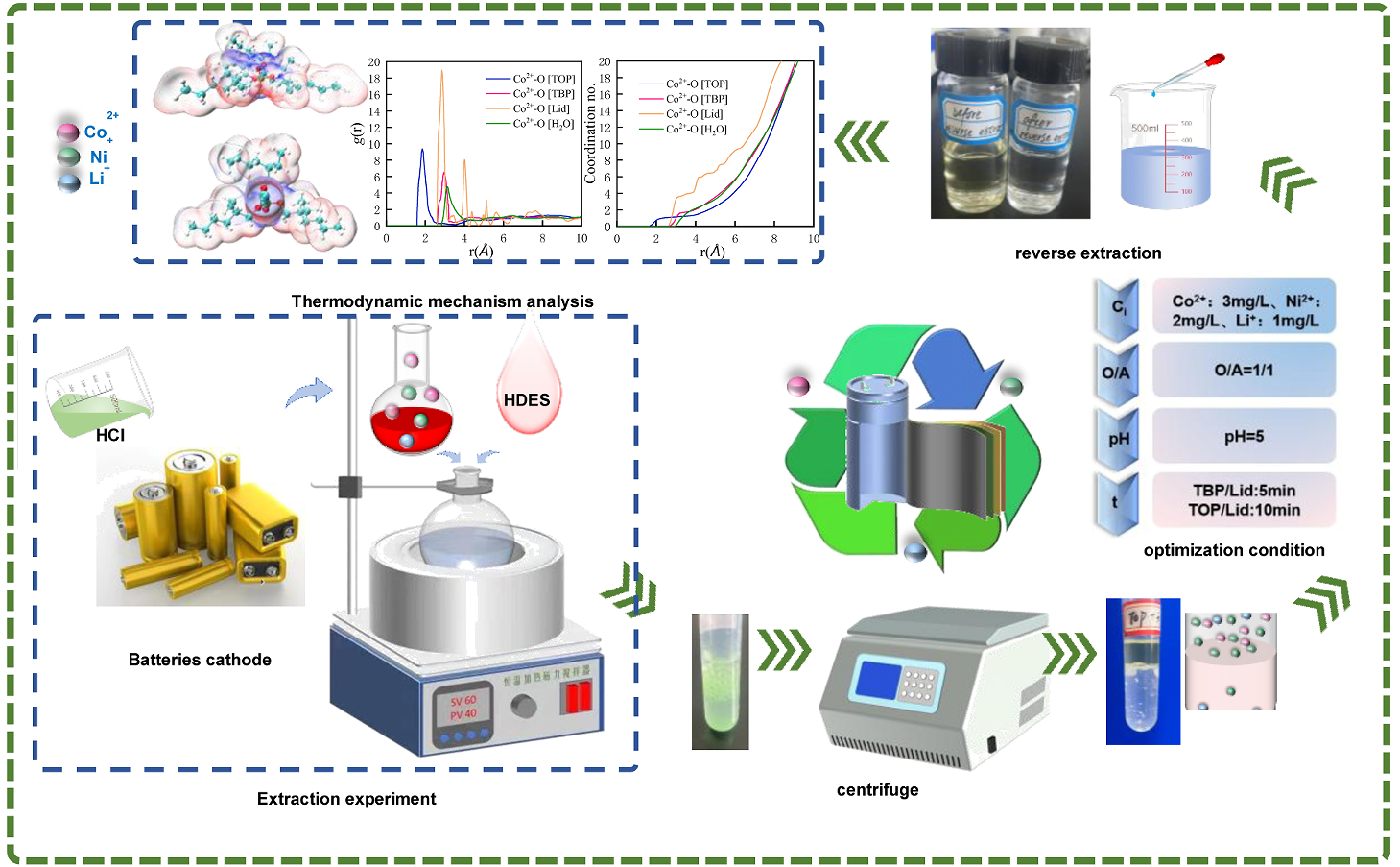 研究团队基于萃取时间、反应温度、水相pH以及有机相/水相比例等变量,进行了萃取条件的优化实验。在优化条件下,HDES[TOP][Lid]对Co²⁺和Ni²⁺的单级萃取效率分别达到了98.5%和83.9%;HDES[TBP][Lid]对Co²⁺和Ni²⁺的单级萃取效率分别为96.0%和82.9%。通过量子化学(QC)和分子动力学(MD)模拟,进一步揭示了HDES中金属离子的萃取机理。分子层面的分析表明,有价金属离子与HDES之间的静电和配位作用主导了金属离子的提取过程,其中Co²⁺和Ni²⁺与HDES的相互作用强度显著高于Li⁺与HDES之间的相互作用强度。