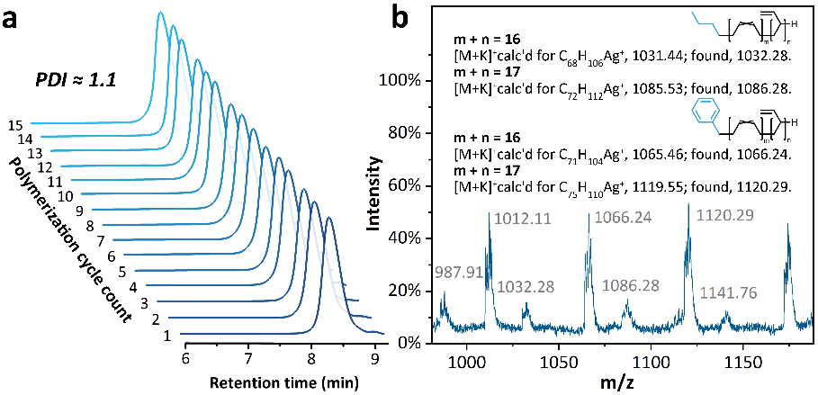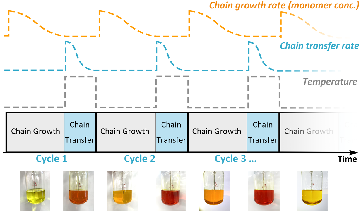 作者通过向传统的阴离子聚合中引入温度响应性的可控链转移反应,实现了引发剂的可控再生,在不破坏体系可控/活性聚合优势的前提下,大幅降低了引发剂用量,引发剂利用率可达1500%。该技术不仅可实现丁二烯、异戊二烯和苯乙烯等单体的活性均聚,还可用于制备嵌段共聚物。这种特殊引发体系由正丁基锂/正丁基钾/1,2-二吡咯烷基乙烷构成,其在较低温度下可引发二烯烃或苯乙烯类单体的活性聚合,而在较高温度下活性中心迅速发生链转移。因此通过控制反应温度交替变化以及间歇性加入单体,实现了链增长和链转移的交替进行。由于其链转移过程的间歇特质,该方法被命名为“脉冲”链转移阴离子聚合(PCTP)。