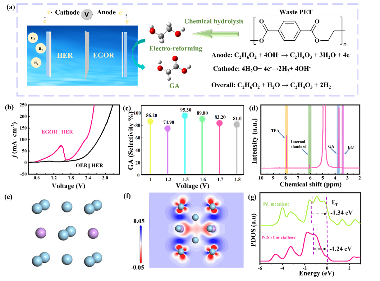 该研究成功合成了具有丰富缺陷褶皱结构的p-d轨道杂化PdSb双金属烯。PdSb双金属烯独特的结构特征使其暴露具有更多的原子和丰富的活性位点。归因于特殊的p-d轨道杂化作用,PdSb双金属烯能够有效的将PET衍生物EG转化为产物GA,且GA的法拉第效率和选择性都很高。本研究为p-d轨道杂化双金属烯双功能催化剂的设计提供了新的视角,旨在促进PET水解产物转化为高附加值产品并为节能制氢做出贡献。