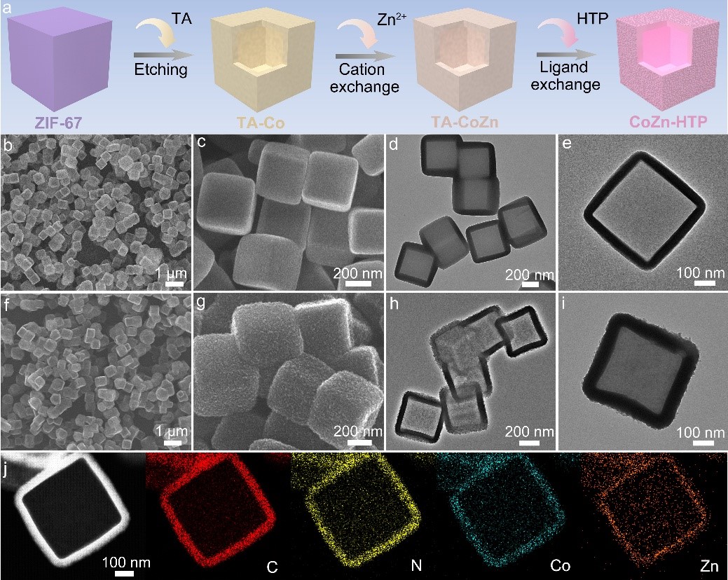 前期,团队设计并制备了高度分散的钴(Co)纳米粒子嵌入硫、氮共掺杂的空心链状碳球(Co@SNC),作为锂硫电池的双功能宿主催化剂。掺杂的硫原子可以有效调节Co纳米粒子与碳基体之间的金属-载体电子相互作用,从而引起电荷重分布并提高d轨道能级。Co@SNC的空心链状结构协同抑制了LiPSs的穿梭效应,并实现高硫负载和快速的电荷/质量传递。这些特点使得基于Co@SNC的锂硫电池具有高可逆容量、优异的倍率性能以及长周期稳定性。为了进一步提高暴露活性位点数量,提高对多硫化物的吸附和催化转化,团队通过化学蚀刻、连续的阳离子和配体交换反应制备了一种具有中空纳米笼结构的新型导电双金属MOF(CoZn-HTP)。实验结果表明,掺杂的Zn原子诱导产生了更多的活性电子,并优化了CoZn-HTP中的d轨道能级,从而提高了对LiPSs的吸附能力和催化转化效率。独特的中空纳米笼结构可以容纳更多的硫,并促进电荷传输。得益于多重结构优势,基于CoZn-HTP电极的Li-S电池表现出优异的电化学性能。