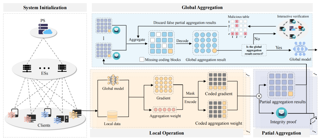 联邦学习作为一种隐私保护的分布式机器学习框架,在数据孤岛与隐私合规双重约束下的跨域协作场景中展现出广阔的应用前景。然而,开放异构的边缘环境存在安全威胁加剧、资源异构受限和动态隐私保护困难等问题,当前联邦学习研究面临本地训练安全攻击防御成本高、模型更新隐私保护算法适应性不强、模型聚合策略与开放异构环境契合难等挑战。为此,项目组针对开放环境中恶意设备发动的安全攻击影响本地训练完整性和正确性的问题,设计了轻量高效的可信证明与验证方法。同时,针对边缘环境资源受限特性和低延迟需求,提出了层次式架构下安全攻击和异构鲁棒的安全聚合方案。理论和实验分析证明了项目组所提方案的正确性和优越性。